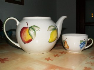 “One foot goes into the tights, then the other foot goes into the tights” etc. - at the breakfast table we play with the coffee cup and the matching teapot. Both have four fruit on them and I name them; she loves the grapes and screams with joy when we get there. And of course, we can’t miss singing “I’m a little teapot” (4 or 5 times – in fact, this is MY favourite song)