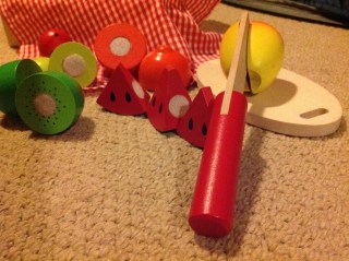 Since the weekend party when she received tons of presents, she’s been playing a lot with the new wooden fruit cutting set. Now she’s trying to say banana (in E.’s language “nana”)