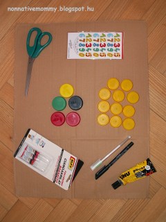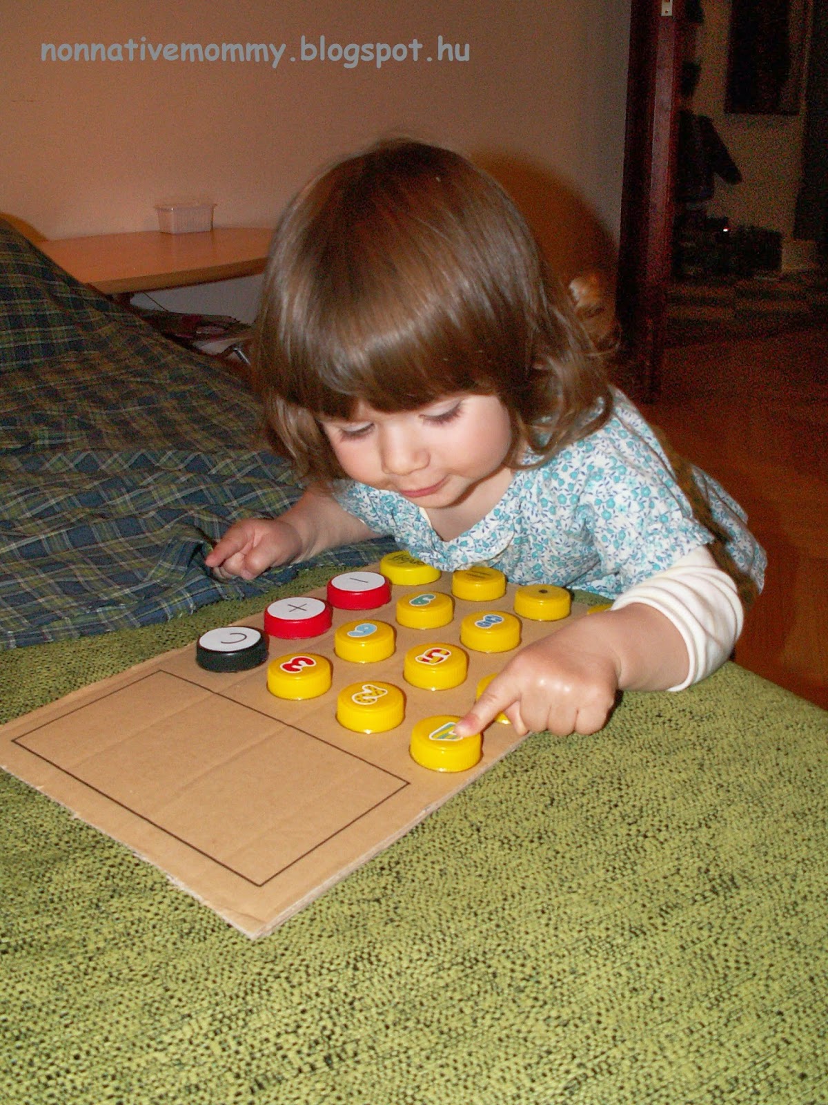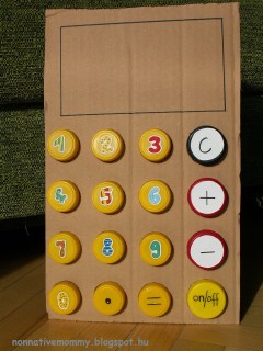 I found this idea not long ago on another blog: Learn with play at home. And I decided to make it as E. LOVES playing with calculators. Sometimes she asks for it and pushes the buttons for 15-20 minutes all by herself saying the numbers and signs (both in Hungarian and in English).