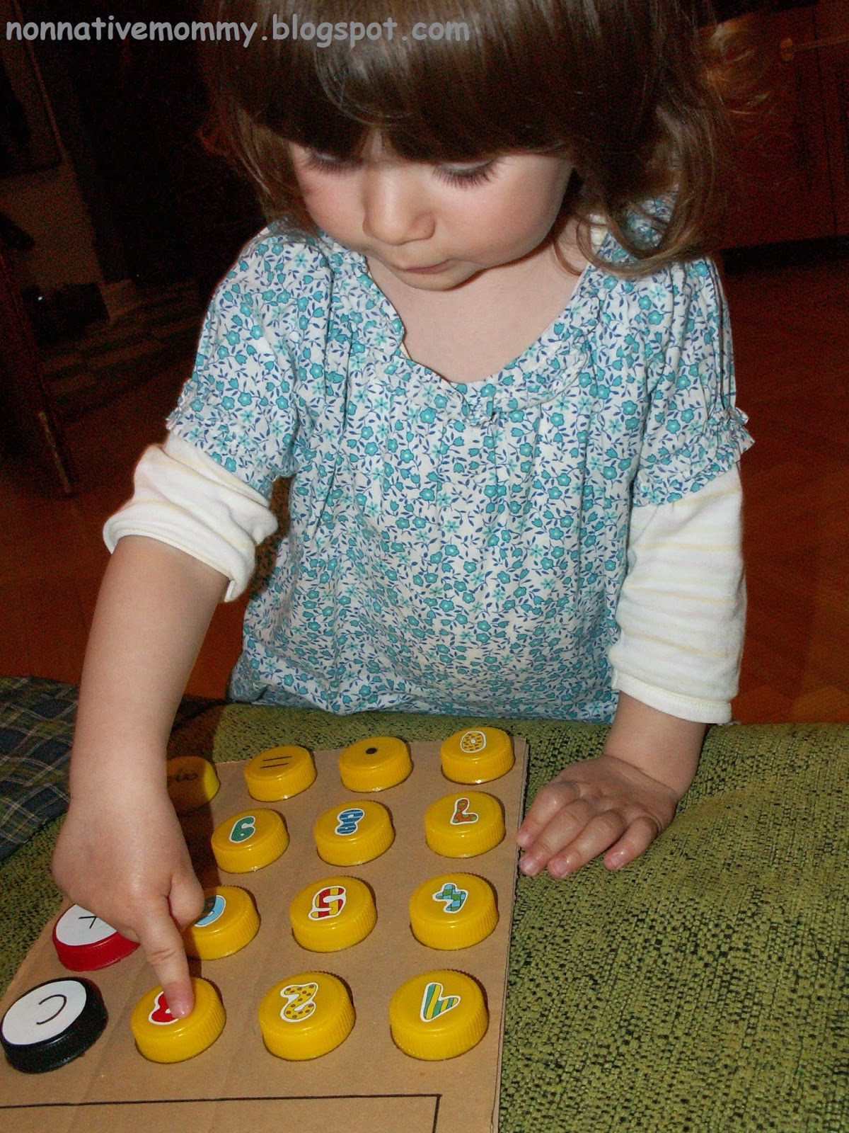 The page I find this idea on also adds an extended version of the calculator game for those who have started learning to write. I’ll introduce it later if E. still wishes to play with the bottle cap calculator.