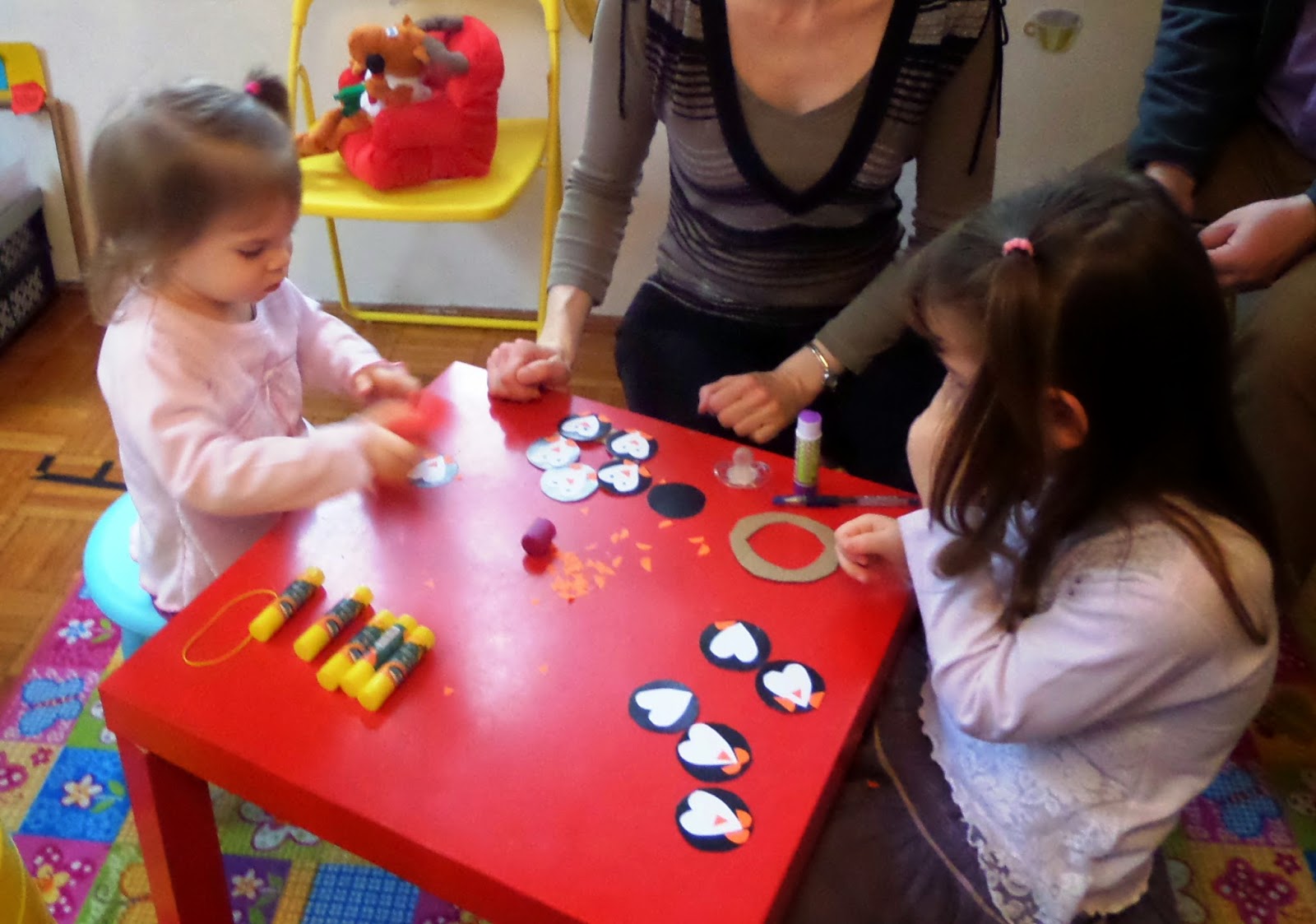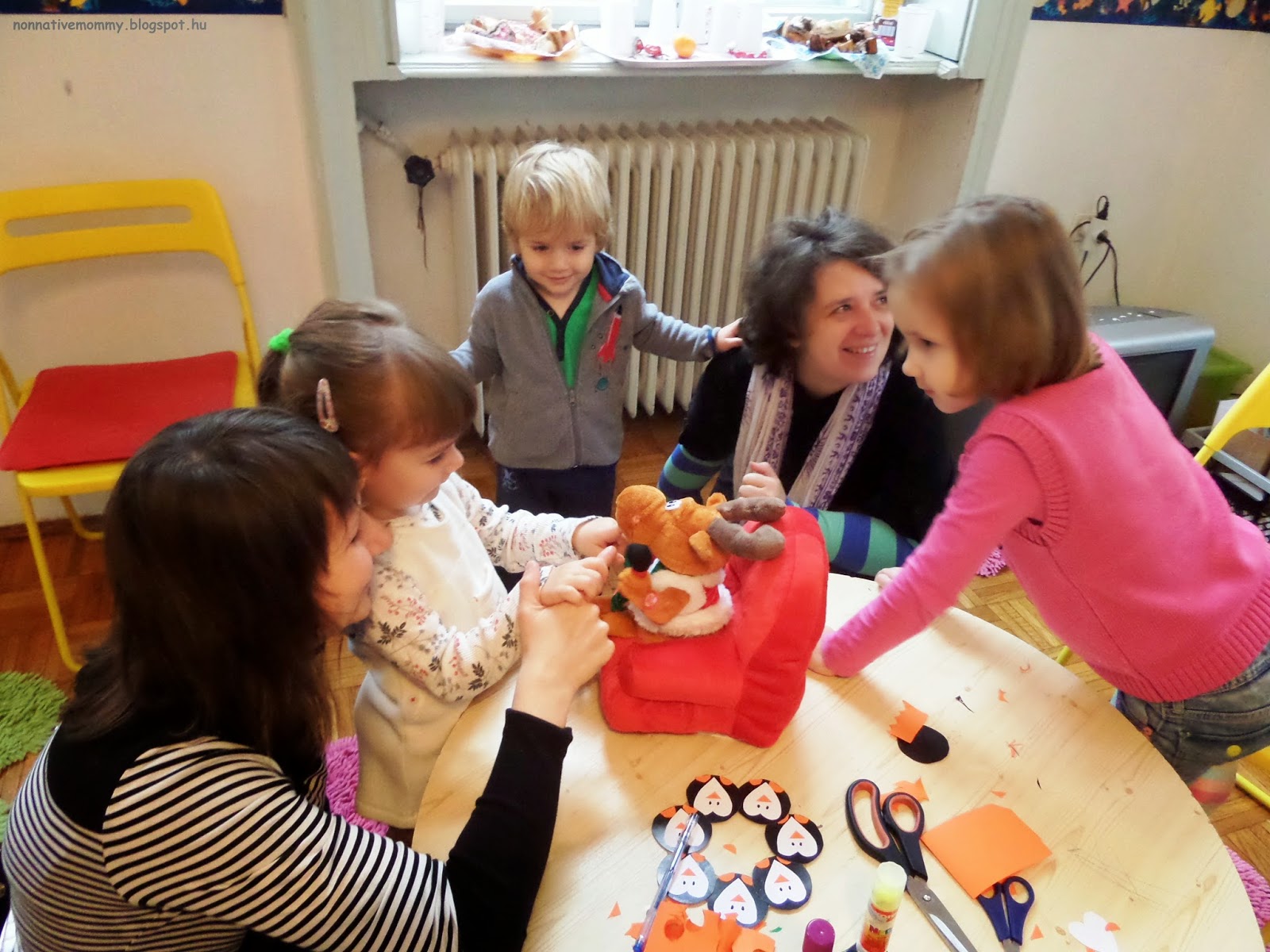 10-12 kids signed up every half an hour on the big day. (FYI: Financial contribution of the event was 500HUF/family). When we arrived the previous group was in with Santa so we had time for some snacks, cocoa and some crafts. It was very simple but a lot of fun activity with a cardboard ring, some black circles, white hearts and some orange scraps. Our teacher, Zs. was preparing the materials and helping the kids with the crafts. And what did we make out of them? This door wreath of penguins: