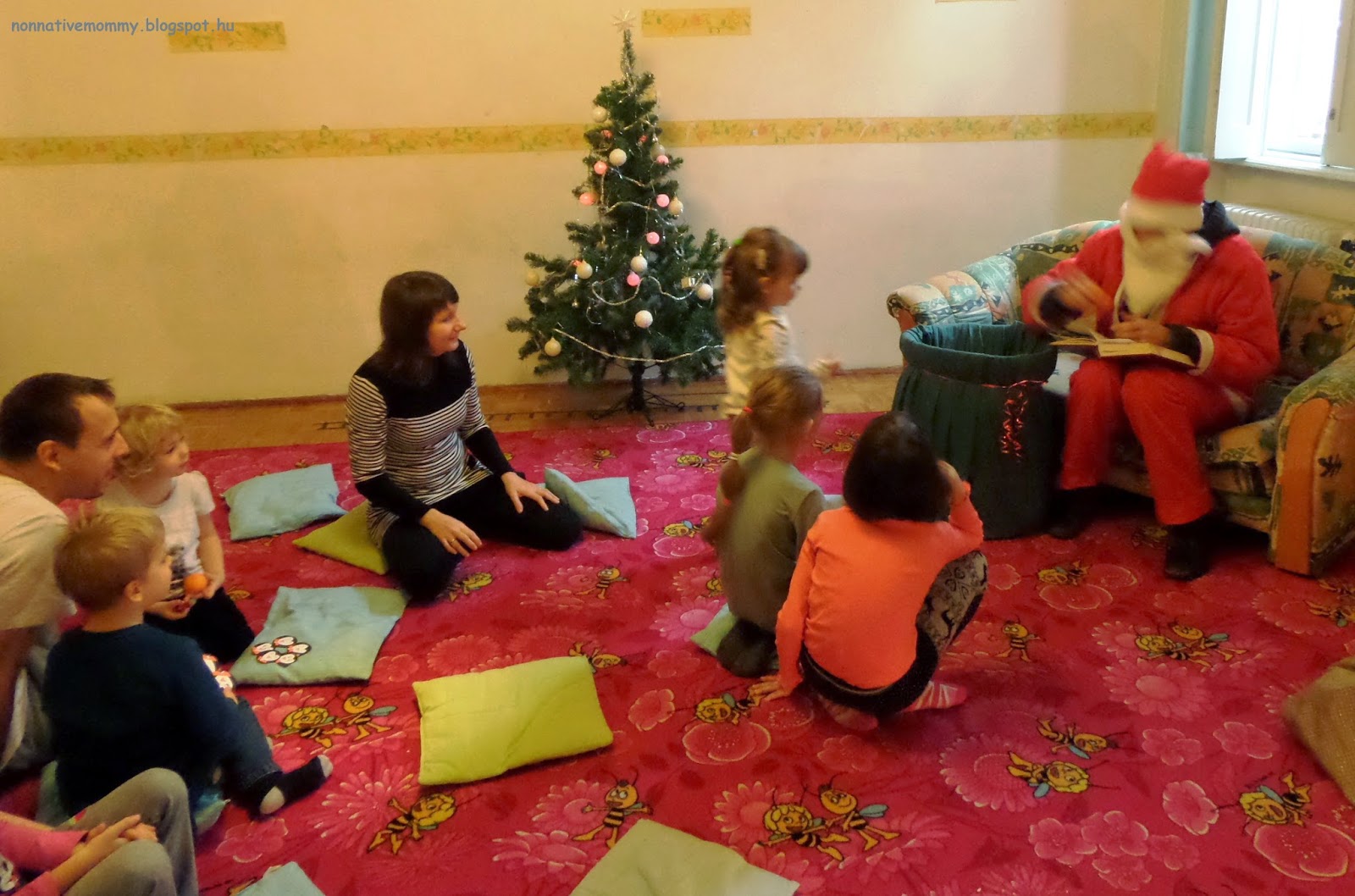 Next, Santa pulled out tiny presents for the children (szaloncukor – the Hungarian traditional Christmas candy and a tangerine) from his bag. We could take some photos with Santa and also the director lady (O.) took some (Thank Goodness!) so this is the only reason why I can include some in this post.