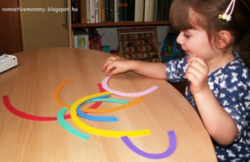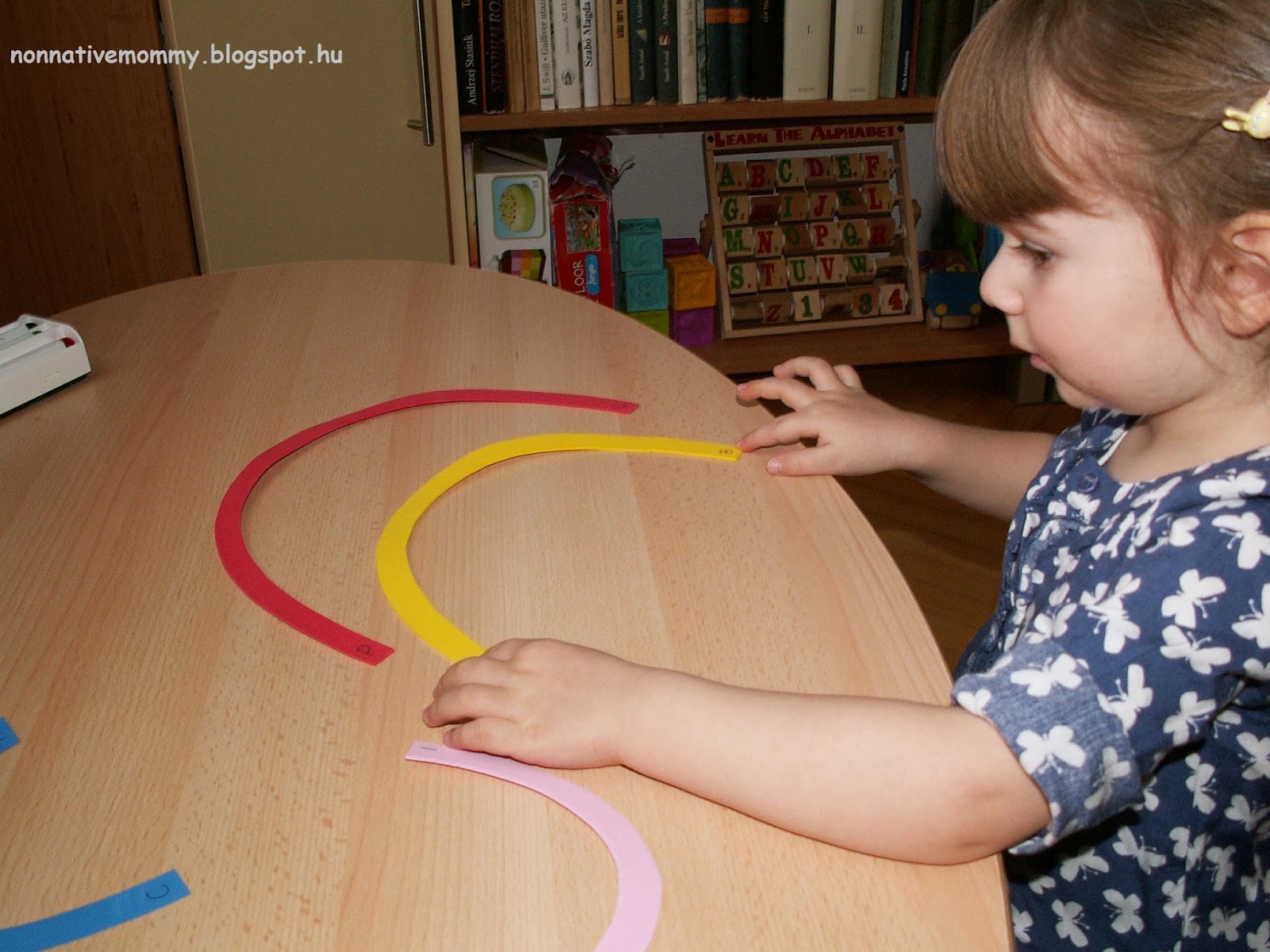 When I first show her the strips she was puzzled and a little frightened as they were wriggling in my hand. But as soon as I put the colourful strips down on the table she loved them.