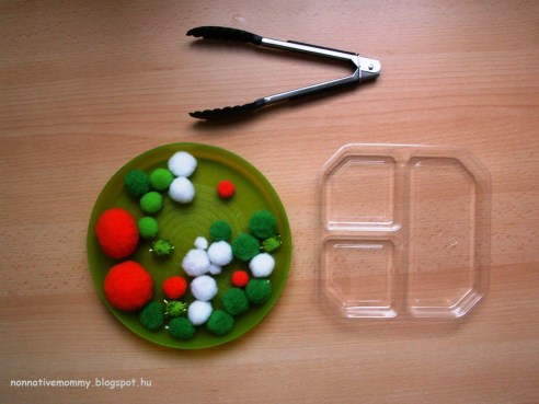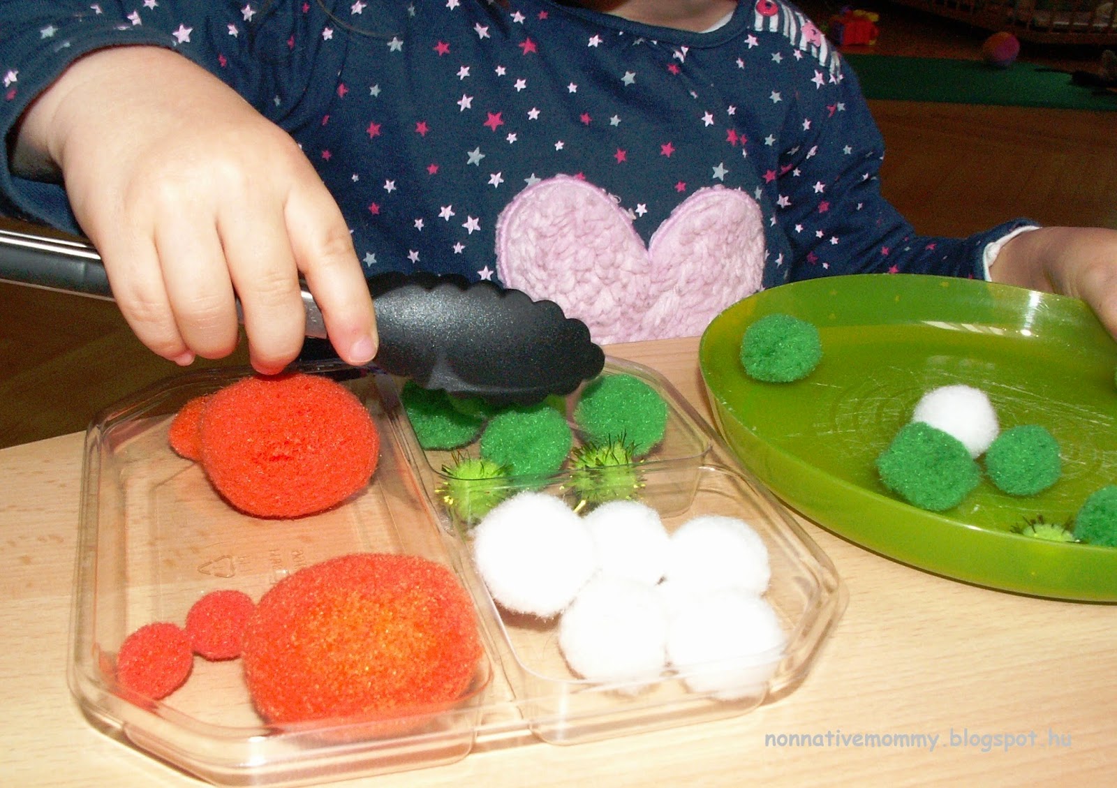 To extend our colour activity I gave E. some pom-poms of 3 colours (of the Irish flag): green, white and orange. With the tongs she separated them in 3 groups.