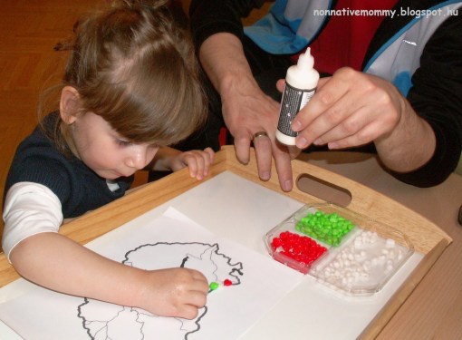 The stones had to be placed along the borderline as on the Hungarian flag (red, white, green) making a pattern ABCABC. This pattern is difficult for my daughter to follow so it was quite a strenuous exercise for her.