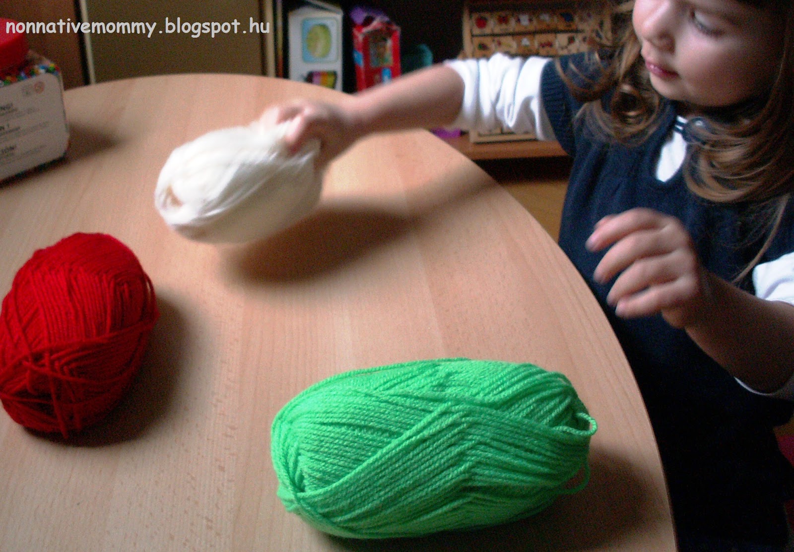 E. tried to make a pom-pom, but she couldn’t. Maybe half a year later she’ll understand how to do it and will be able to make it. We’ll give it a try again.