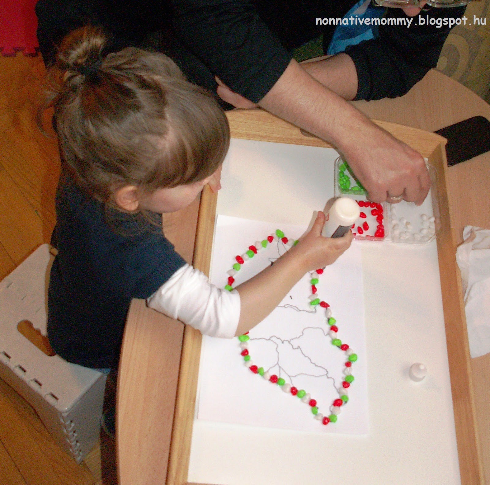 Red, white and green are used in almost all of our activities. I bought some decor stones in a One Euro Shop (I had to separate the red, white and green stones from many other colours)
