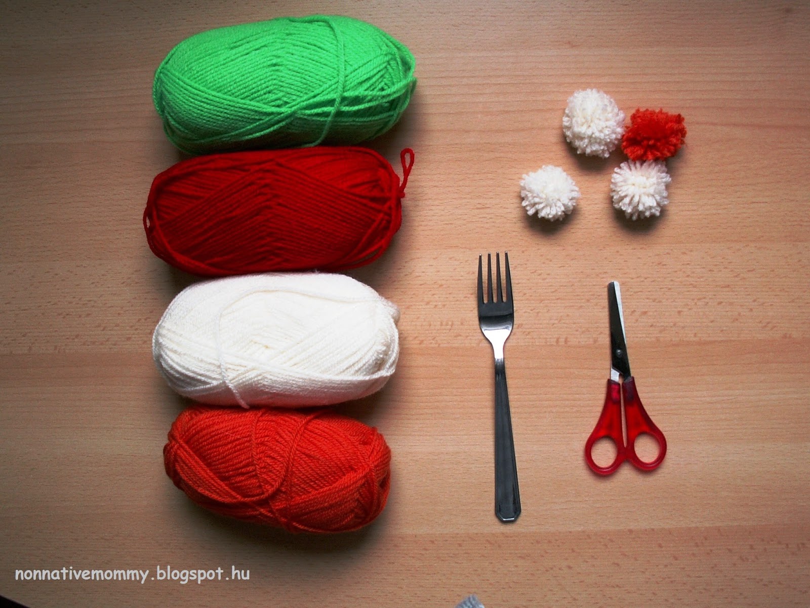 - red, white, green (and orange) yarn