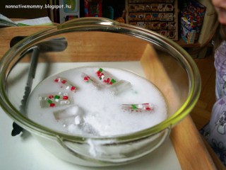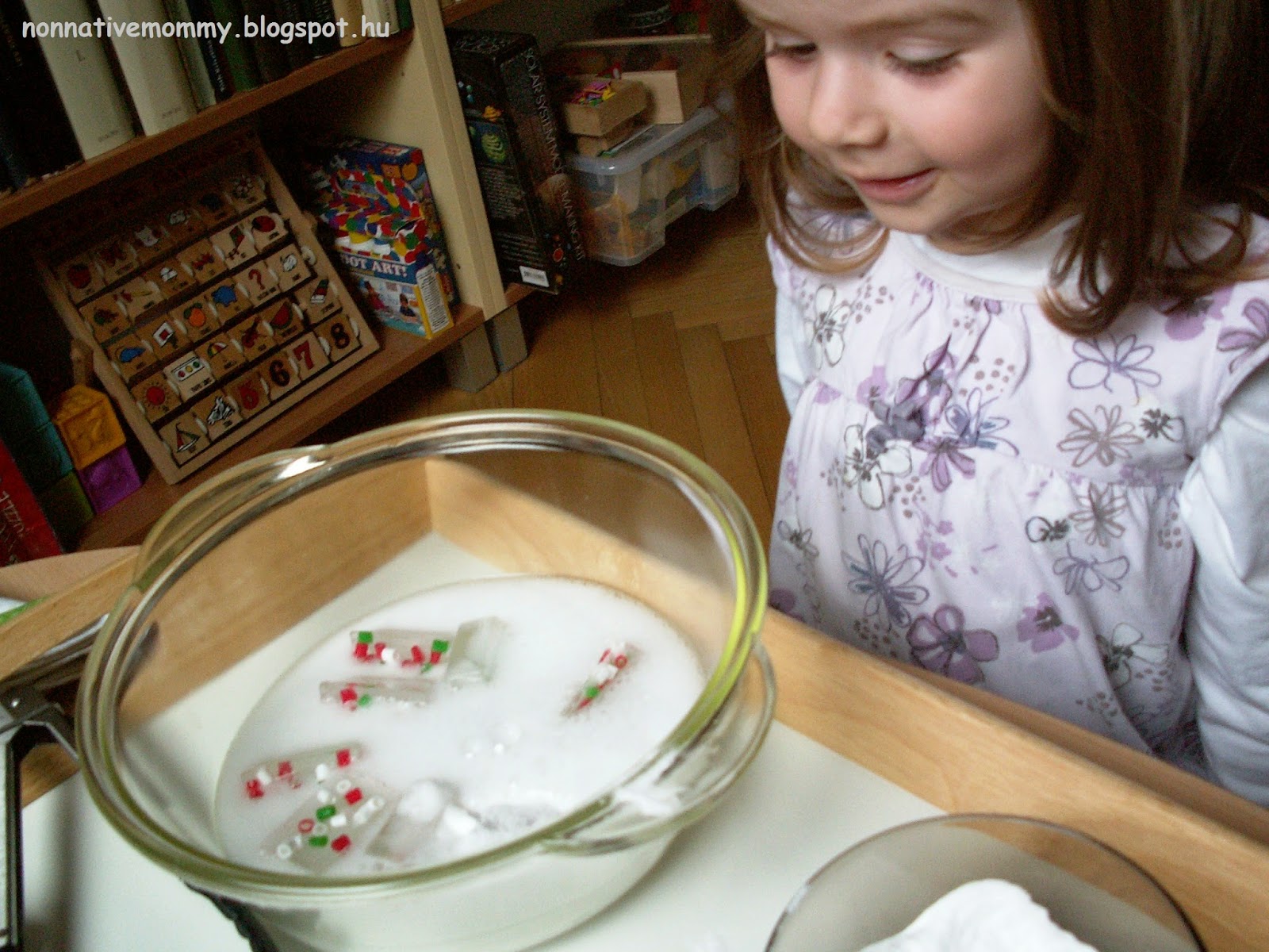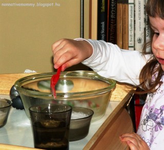 We did this preparation in Hungarian and talked about the colours of the Hungarian flag and how water turns into ice under 0 Celsius degree. She listened closely and asked questions about what liquid is and what frozen means. I gave her a basic explanation.