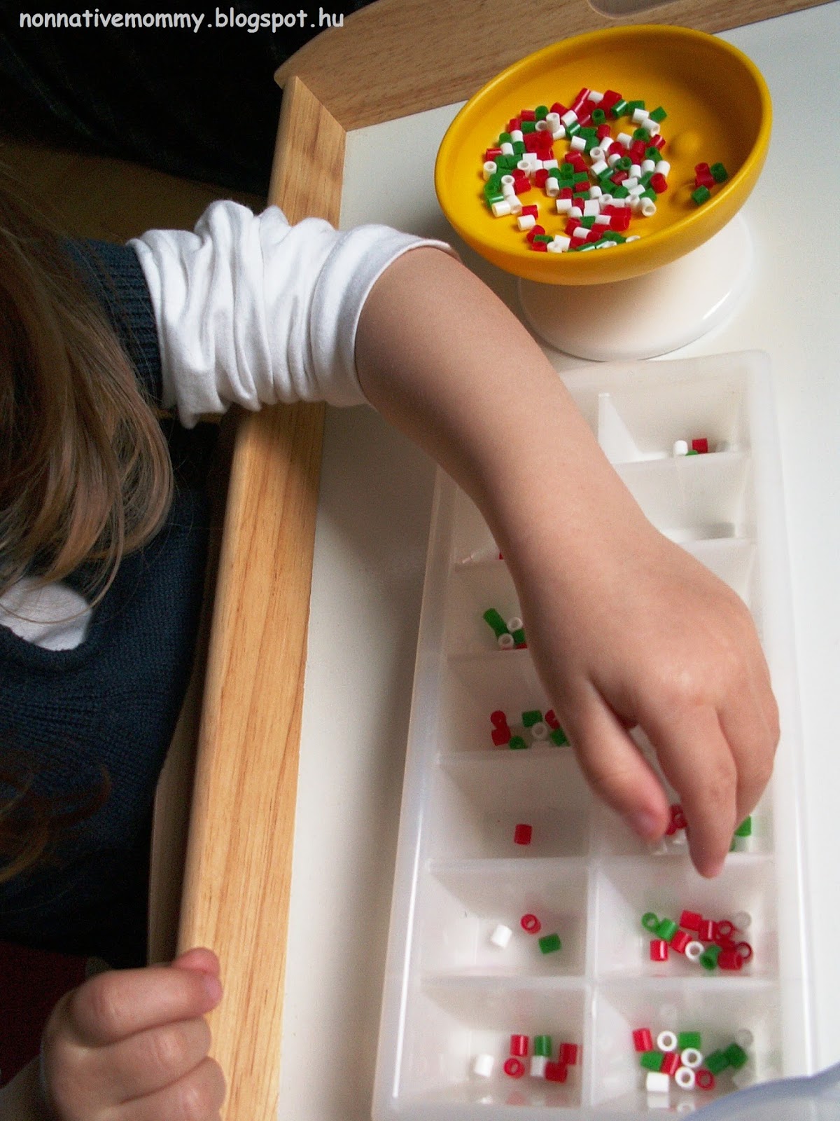We’ve altered the task she introduce on her blog to suit our Hungarian National holiday and I used red, white and green IKEA beads instead of sequins.
