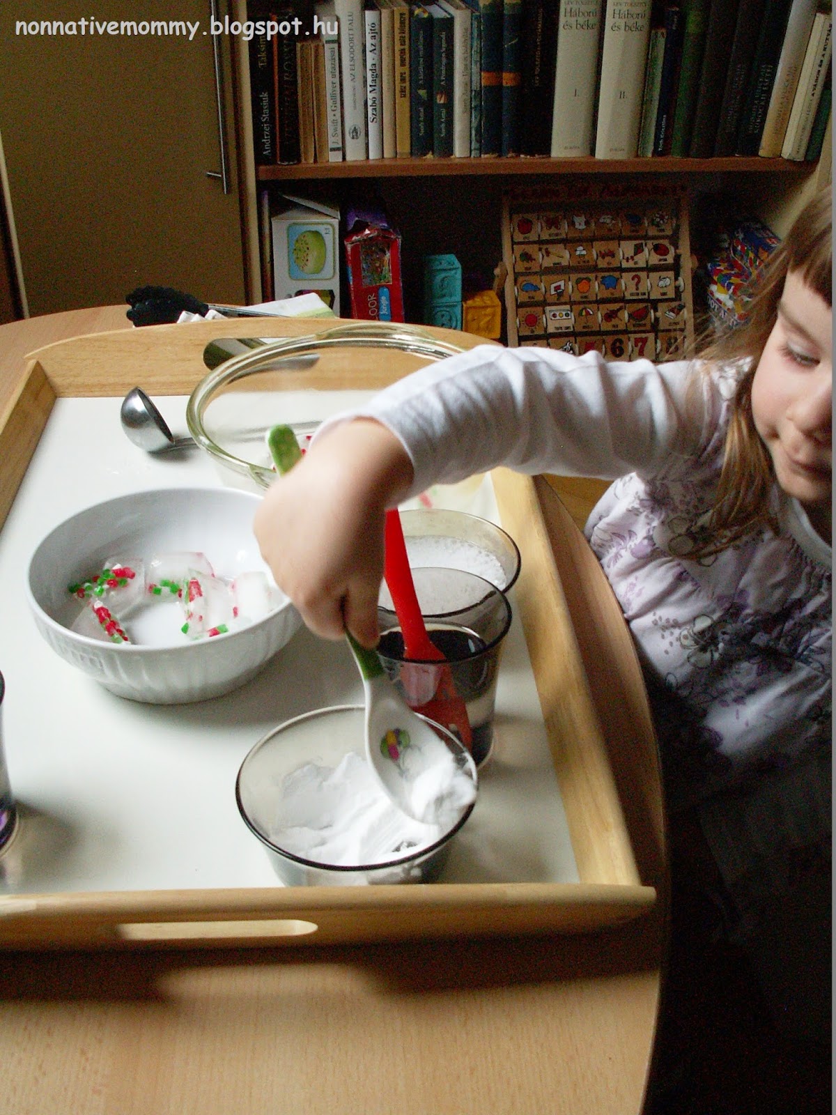 The next day we took it out of the freezer and I set up this tray for E. We were in English this time.