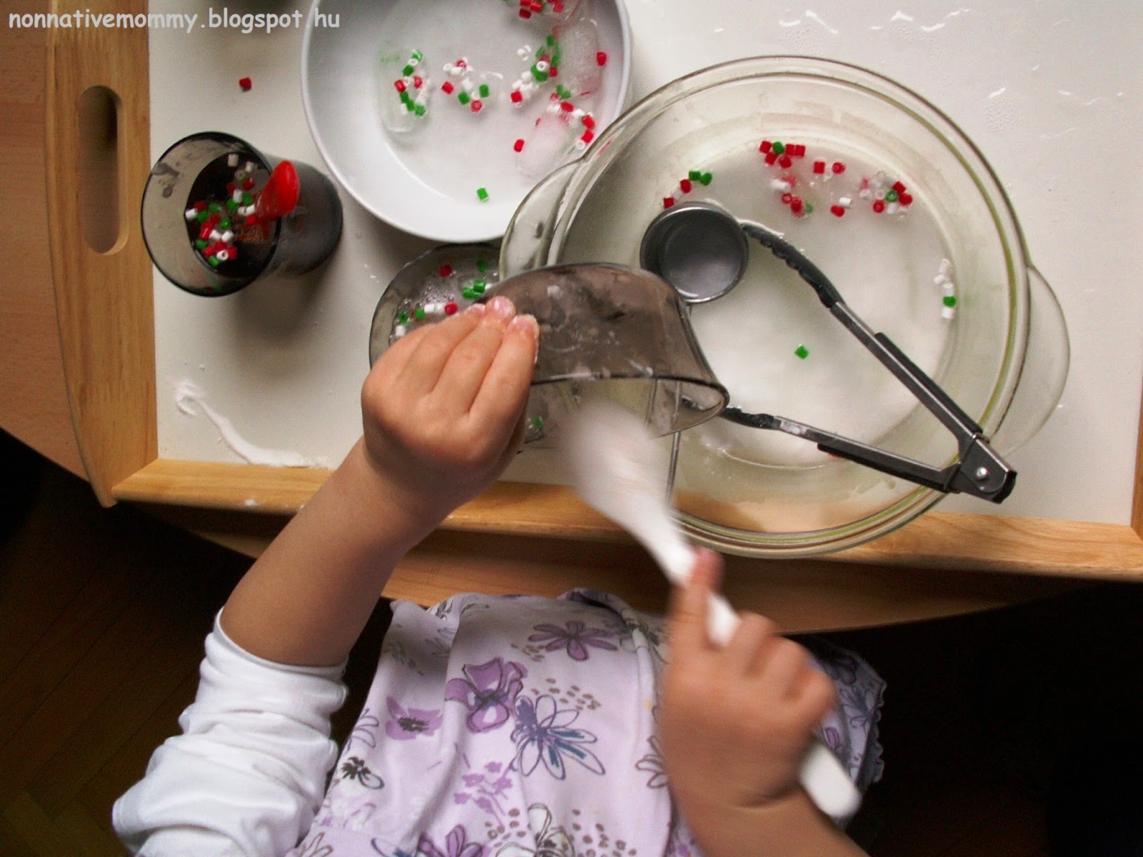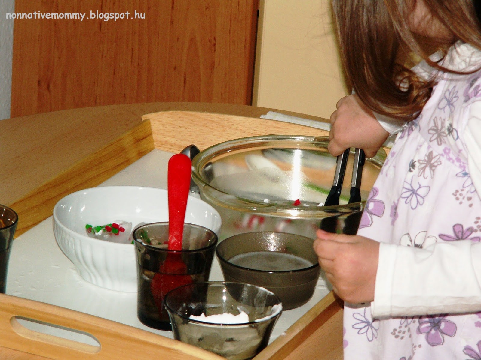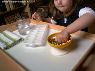 She used all the tool (tongs, fork, spoon and ladle) I prepared for her. Picking, spooning, ladling. First, she was touching the ice cubes with her hands. Abruptly, she said: – It’s cold and wet. I don’t want to be wet.