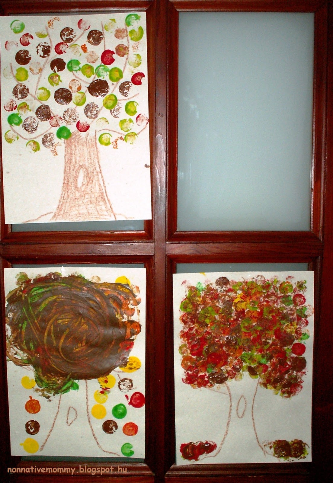 Can you guess which one is E.’s painting? Just after having finished, E. said something about the wind and tons of leaves and was smudging brown paint all over her tree top. Well… no comment 😜