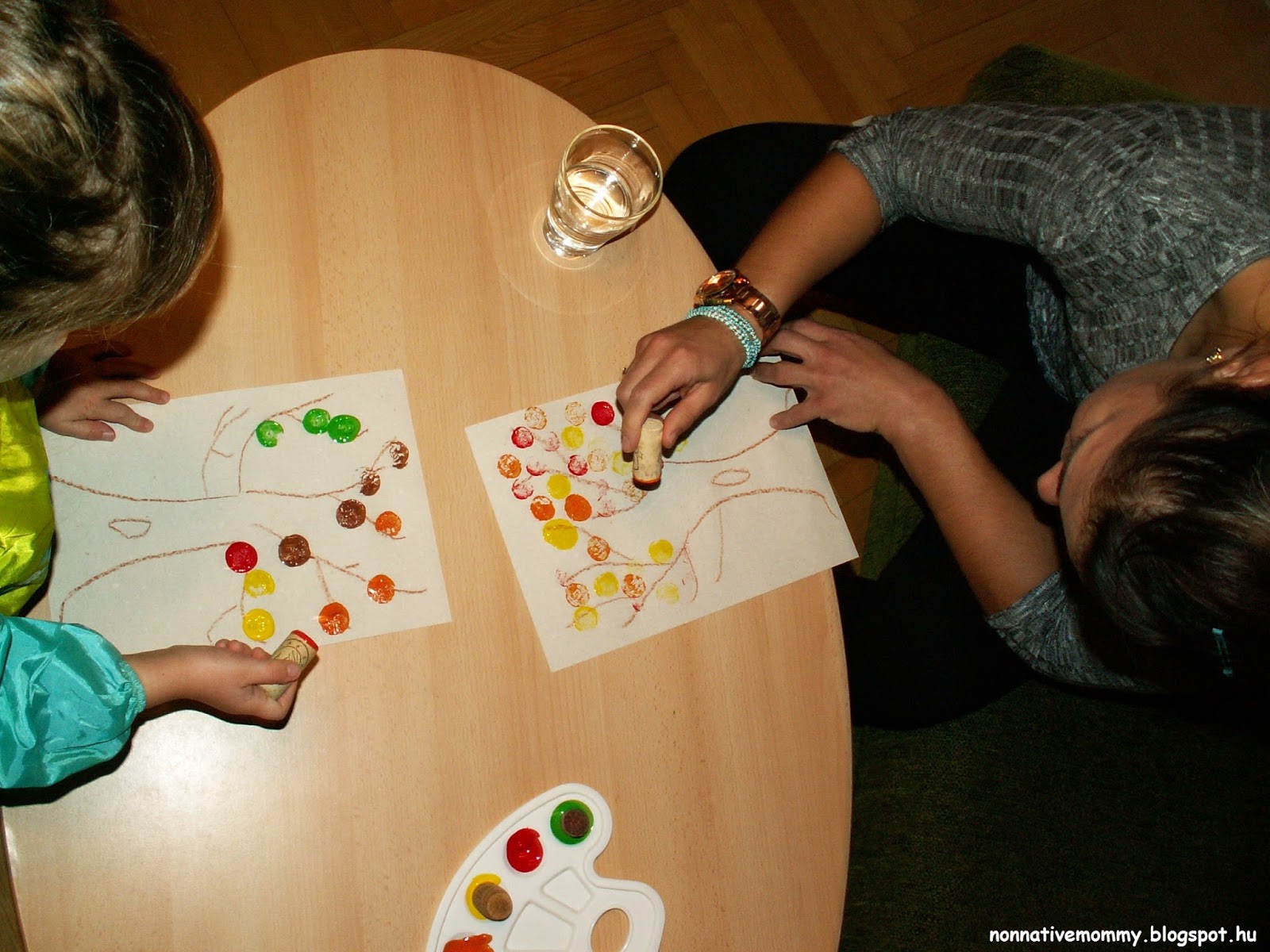 (I didn’t prepare much for this activity. I just put out the paint – orange, yellow, red, and brown -. a palette and two sheets of paper with a bare tree drawn on them. I forgot to take a “before” photo. 😒)