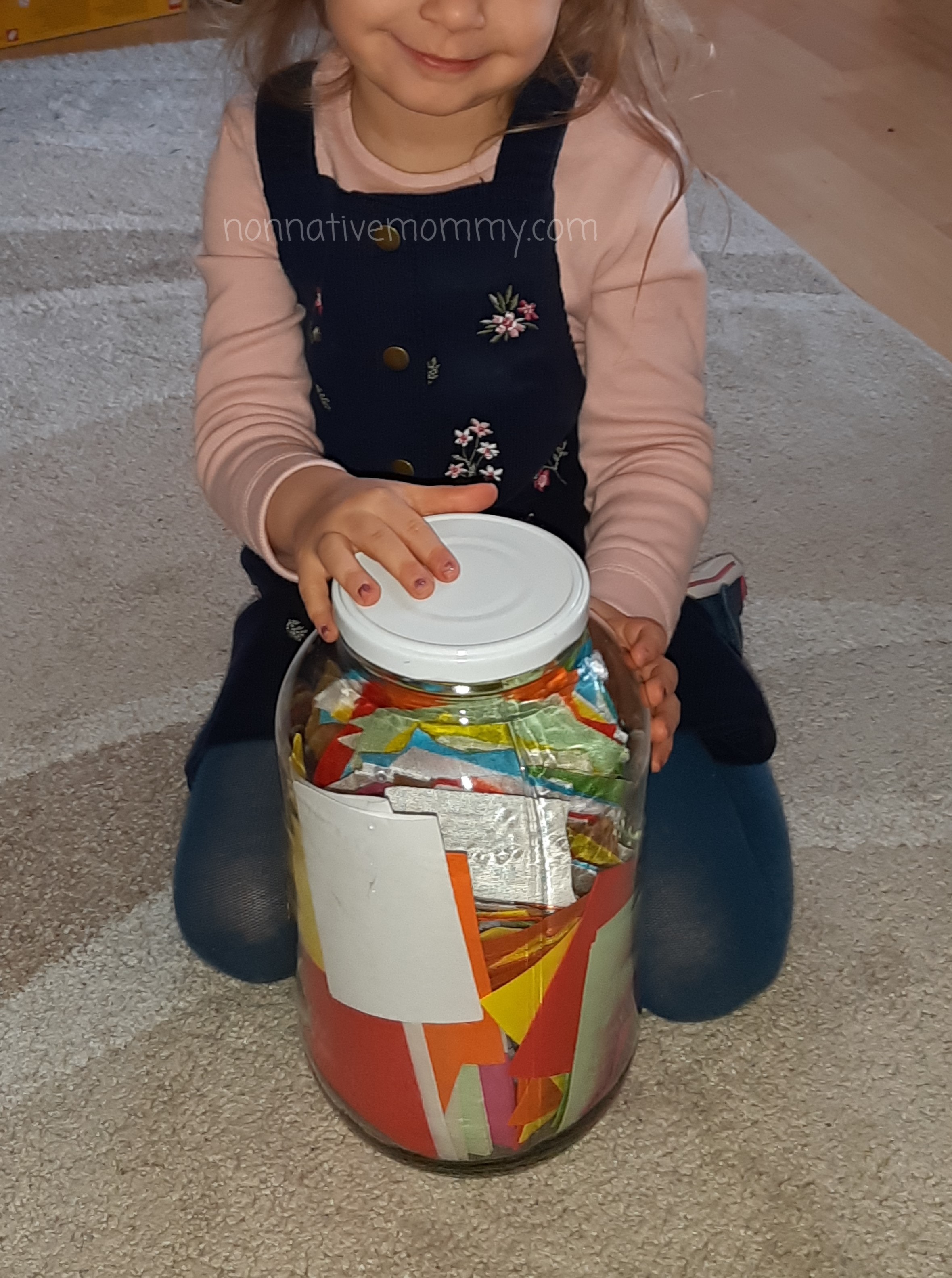 We “pour” the paper pieces out of the jar over Little L. who was “swimming” in them.