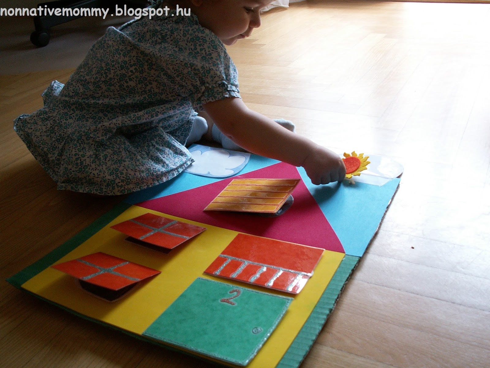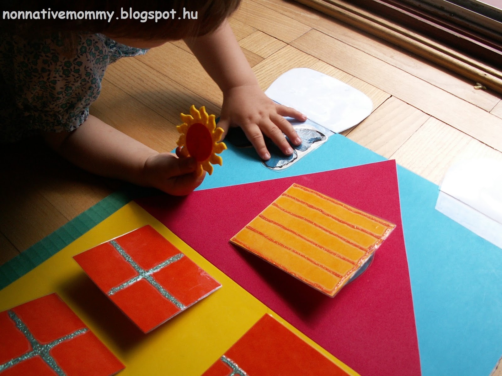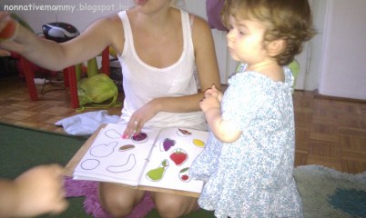 I was really happy as this is one of E.’s favourite topics. Her eyes sparkled when she saw a picture of an apple and a straberry in the teacher’s hand. She looked at me and glowed with delight. I felt she knew the whole session will be about fruits. So I wasn’t surprised at all when in the middle of the lesson she was brave enough to say apple, pear and nana (for banana). She says strawberry in Hungarian (she always chooses the easier word of the two languages – very smart). The activities we had: