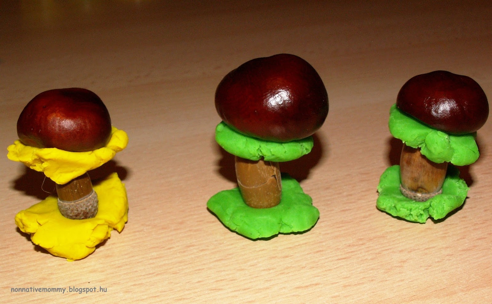 Not as good-looking as the original idea, but they represent our family: E. mushroom, Daddy mushroom and Mommy mushroom. (from right to left)