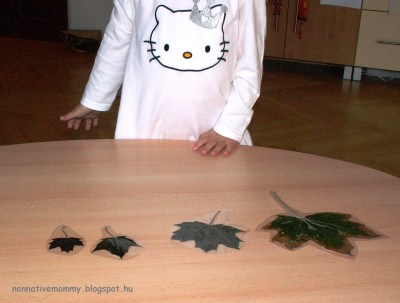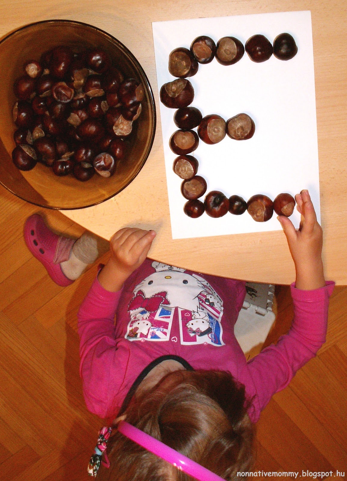 I prepared my daughter’s name, each letter on a different piece of paper. First, she put the letters in the right order, then following the lines of the letters, she placed the conkers along the lines.