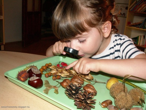 So during E.’s nap time I put together this tray of all kinds of fruits and a magnifying glass. As soon as she discovered the tray she eagerly examined their texture, the surface and the inside of the fruit.