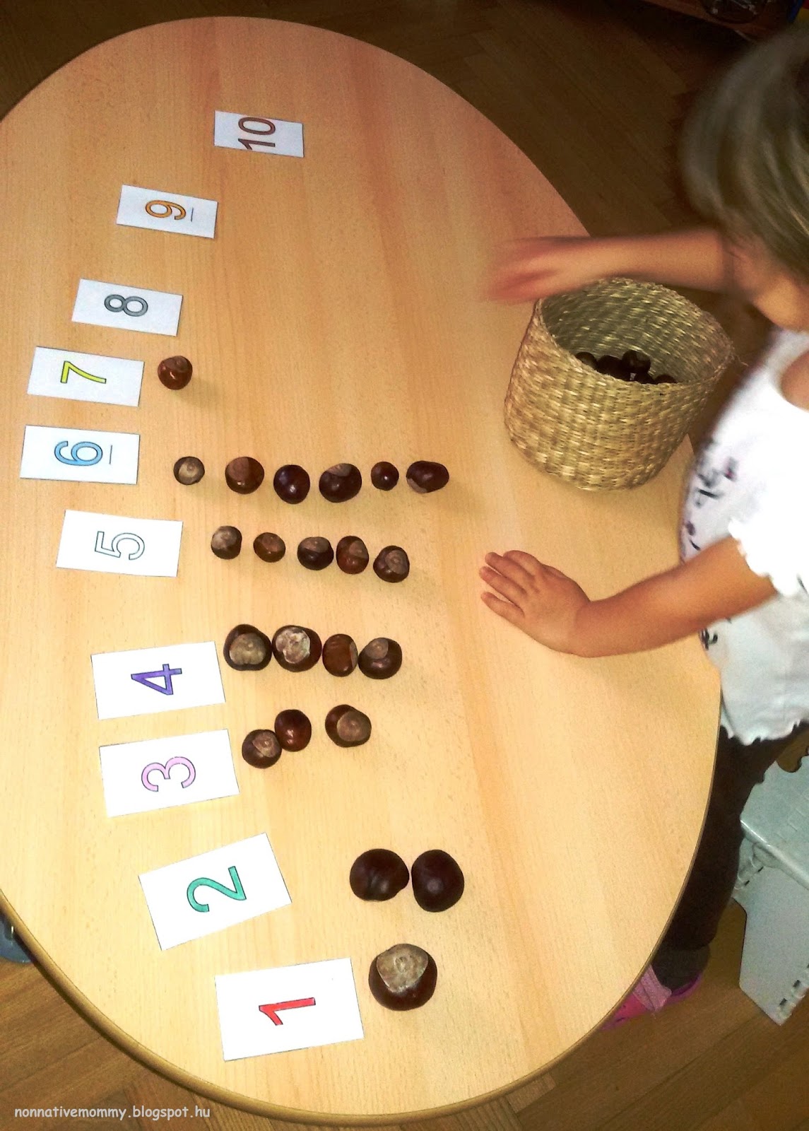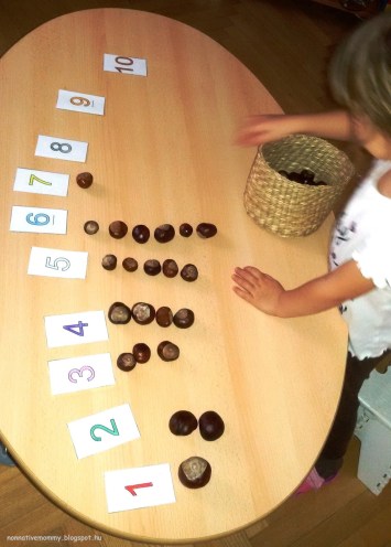 I put the conkers in a woven basket and placed the number cards on the table. E. needed to put the right number of conkers below the cards.