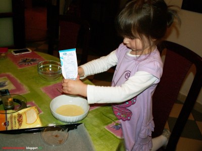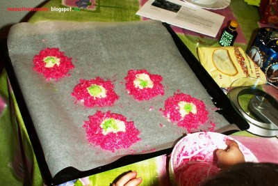 Around the green ball make a white “sausage” then around it a red one. They should touch each other. Our mixture didn’t turn out so well. I couldn’t make “sausages” so I just placed the stuff in circles. E. was very helpful… with cleaning (i.e. licking).
