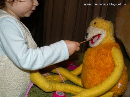 E.’s favourite is the dental department where one has to remove plaque, clean the teeth with a brush, drill them and kill germs, plus, at the end the player can choose coloured braces as well. E.’s favourite  part is killing the germs in the mouth. The other departments also means a lot a fun. You can take X-ray photos of broken bones, or you can injections or examine blood in a laboratory.