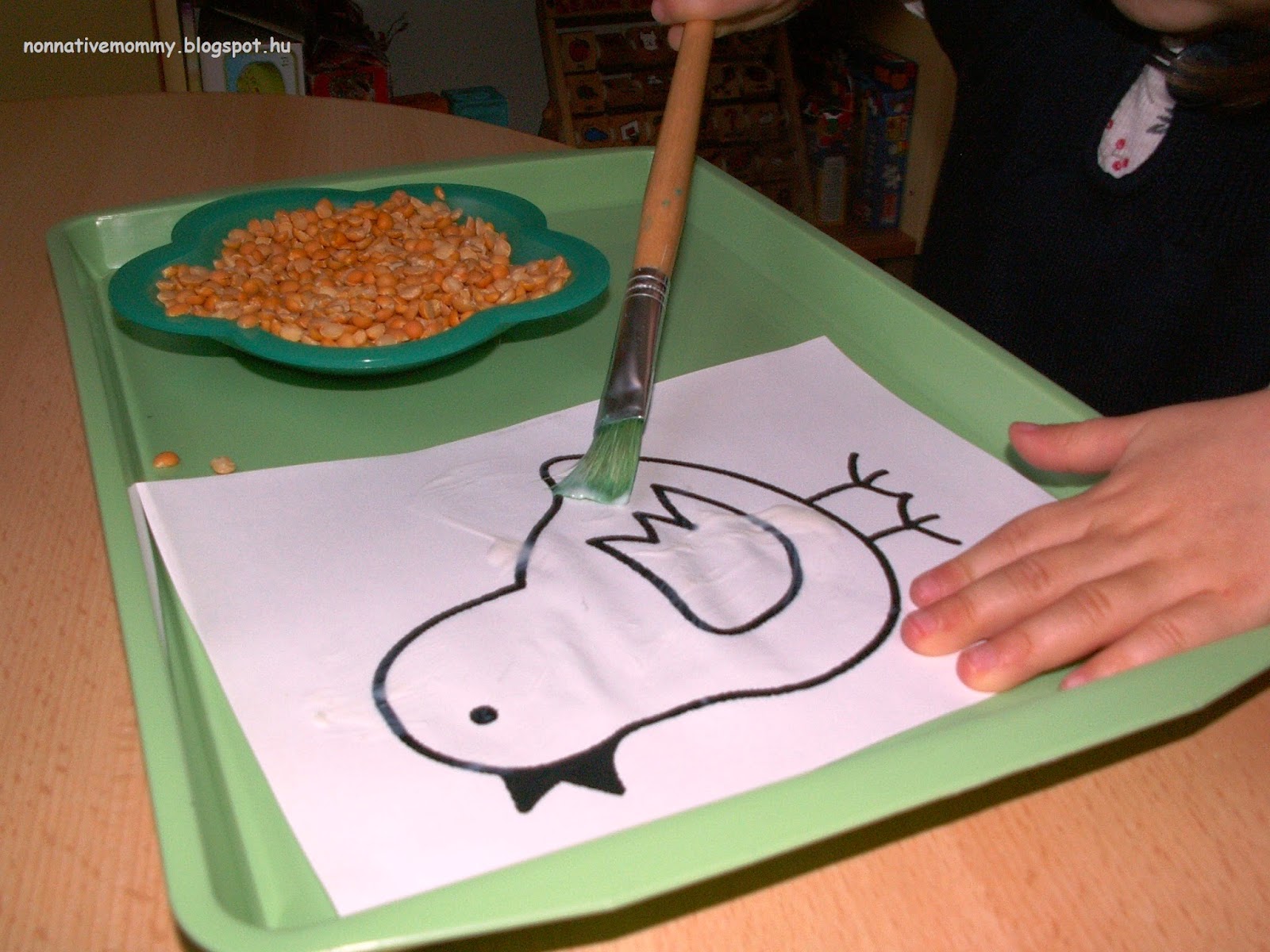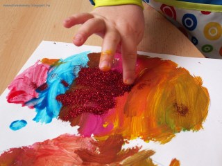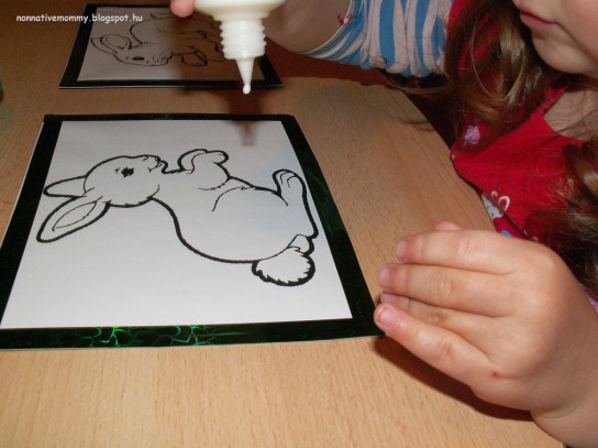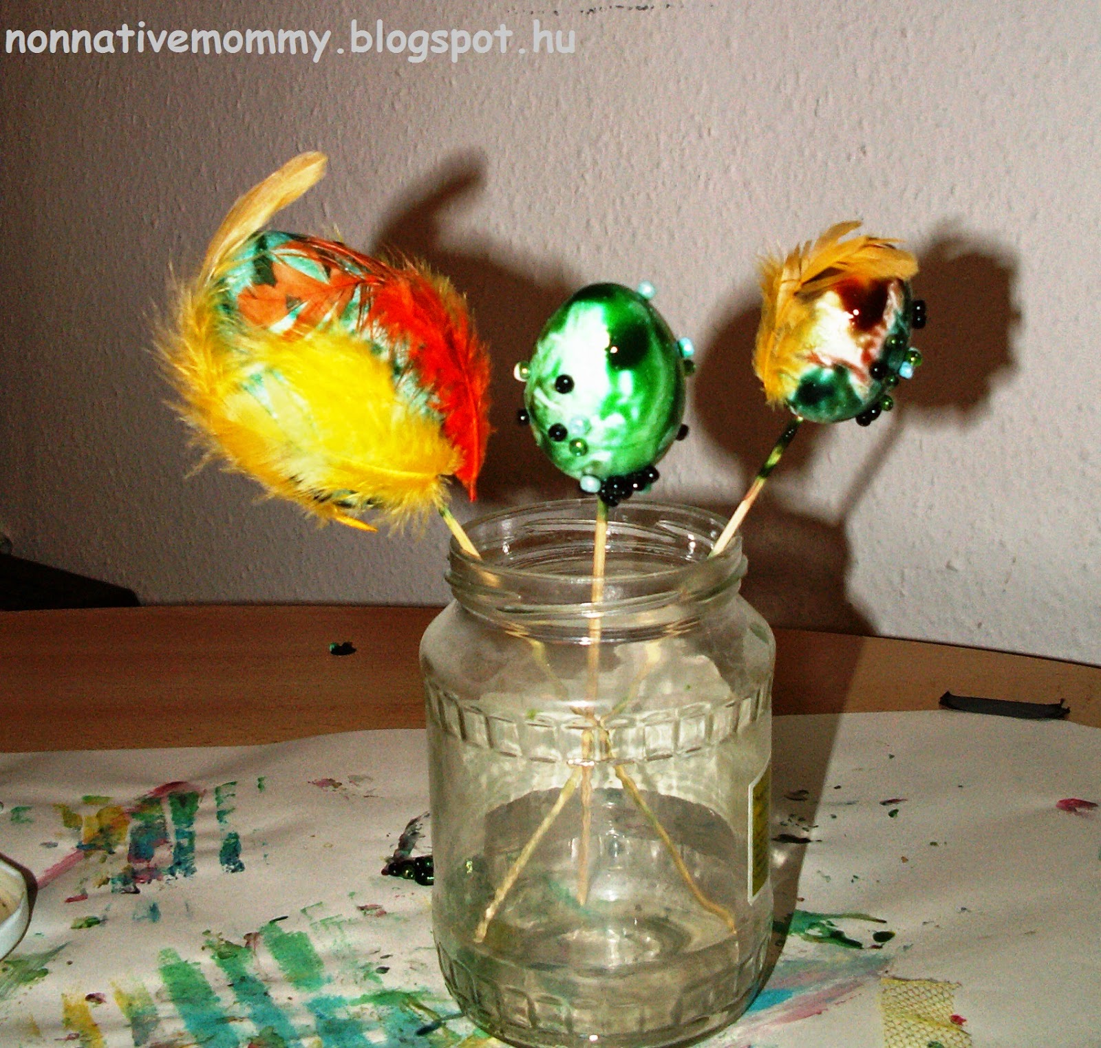 I was crazy enough to let her sprinkle a little glitter over the wet, painted eggs (well, never again, it’s more than MESSY). I must admit she helped me happily with the cleaning up.