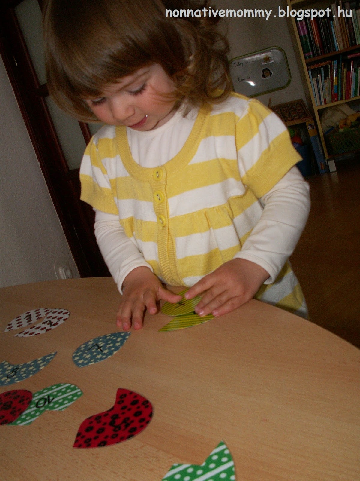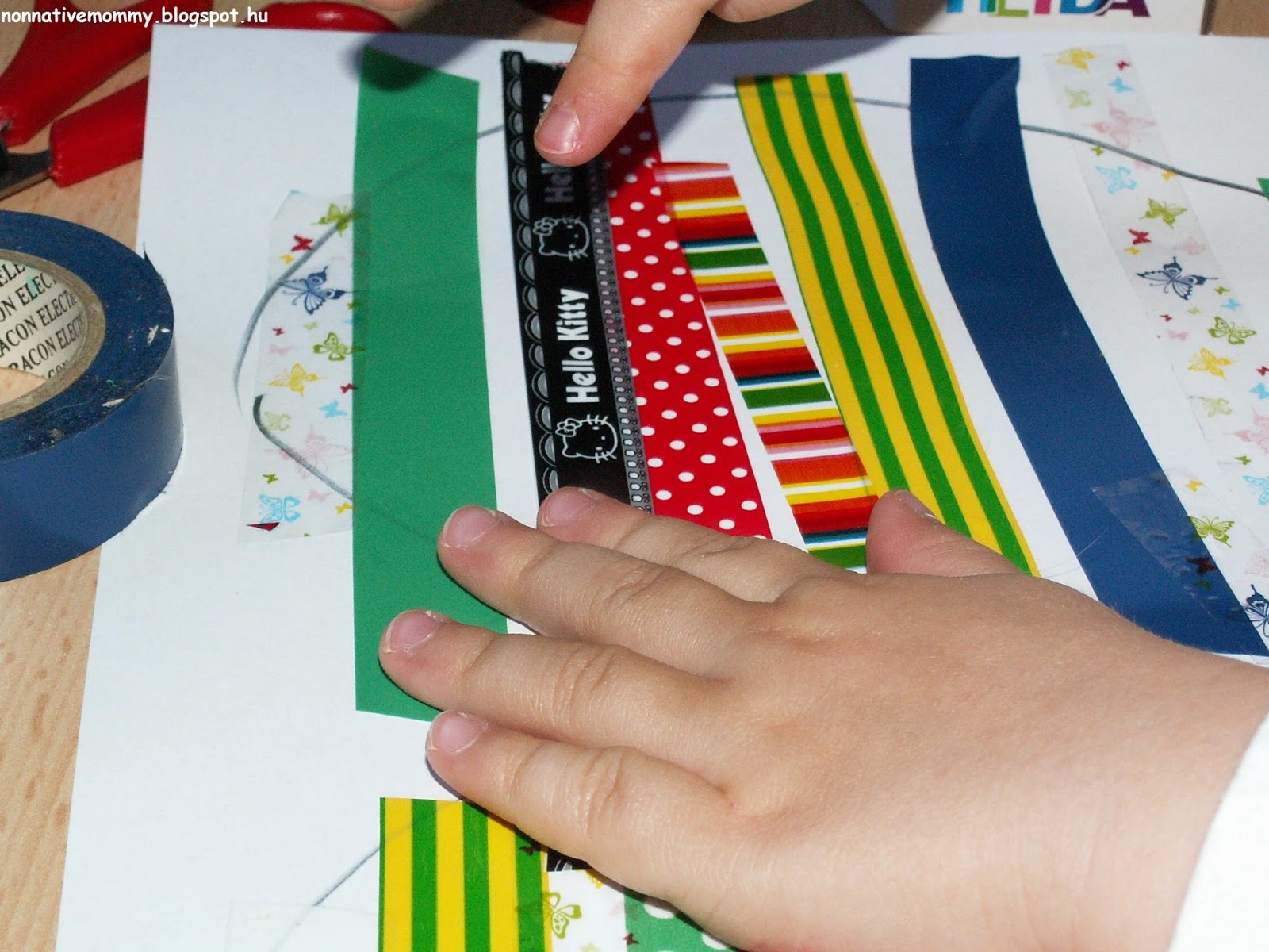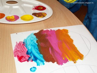 The original plan was to follow some patterns (ABAB or ABBABB), but it didn’t work that way. I plan something and E. thinks differently. So we went with the flow. Some hand painting, making fingerprints, drawing lines, colouring freely etc.