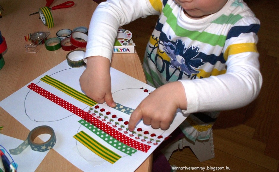 Just draw an egg and supply your little one with some decor tape or washi tape. Be prepared: tape will be everywhere. In hair, on clothes and some on your drawn egg, too. If you want to save a pretty decor tape, do NOT give it into the hands of a 3 year old (or below).