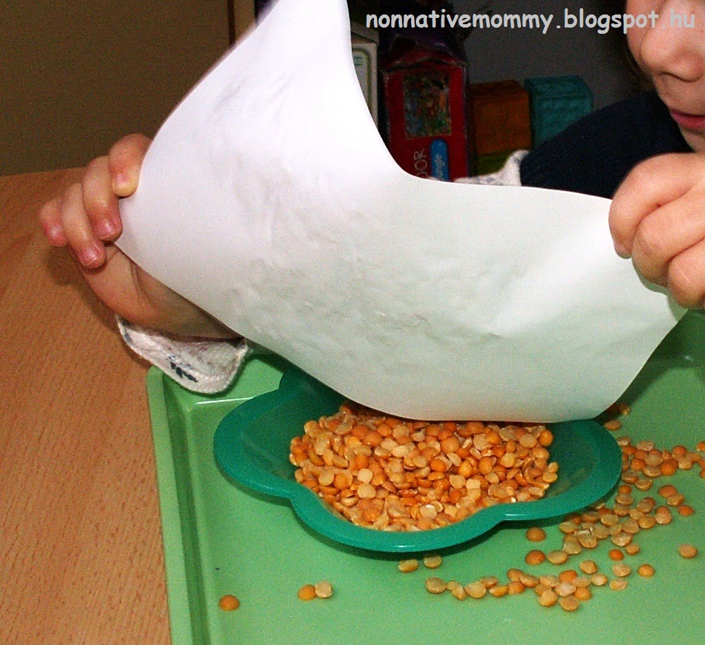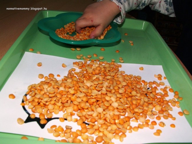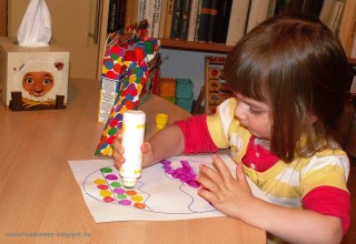 First, E. started to use the colours one by one (although she was drawing with the pom-poms like with a paintbrush; she refused to make dots like with the dot marker)