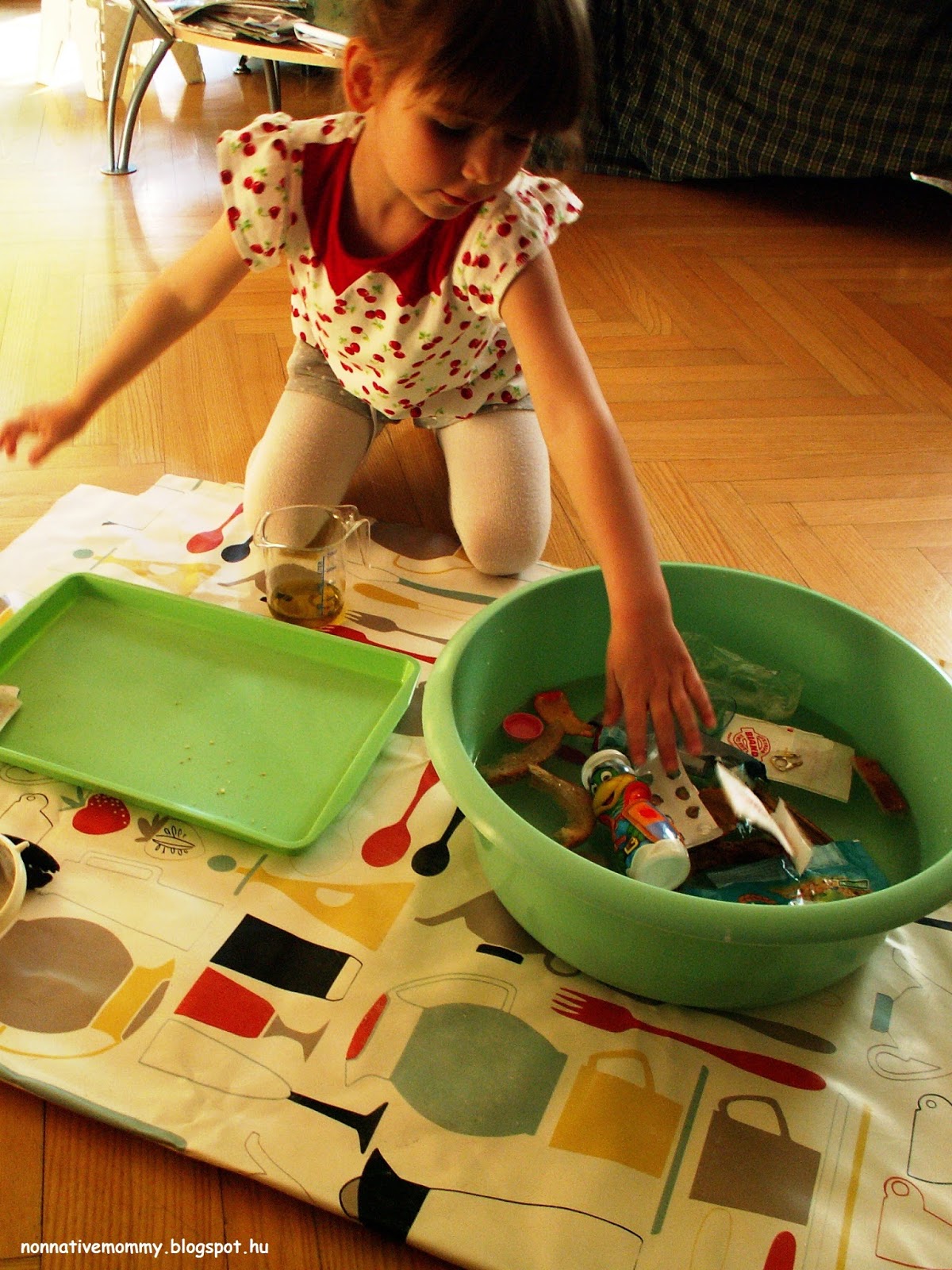 - soap cloud (We placed a bar of soap into the micro for few minutes. When the soap is heated, the soap’s molecules of air move quickly and they move far away from each other. This causes the soap to puff up and expand to an enormous size. The brand BABA didn’t prove very airy inside. Ivory soap is suggested online but it’s not available in Hungary. Still, E. had fun playing with the soap cloud.