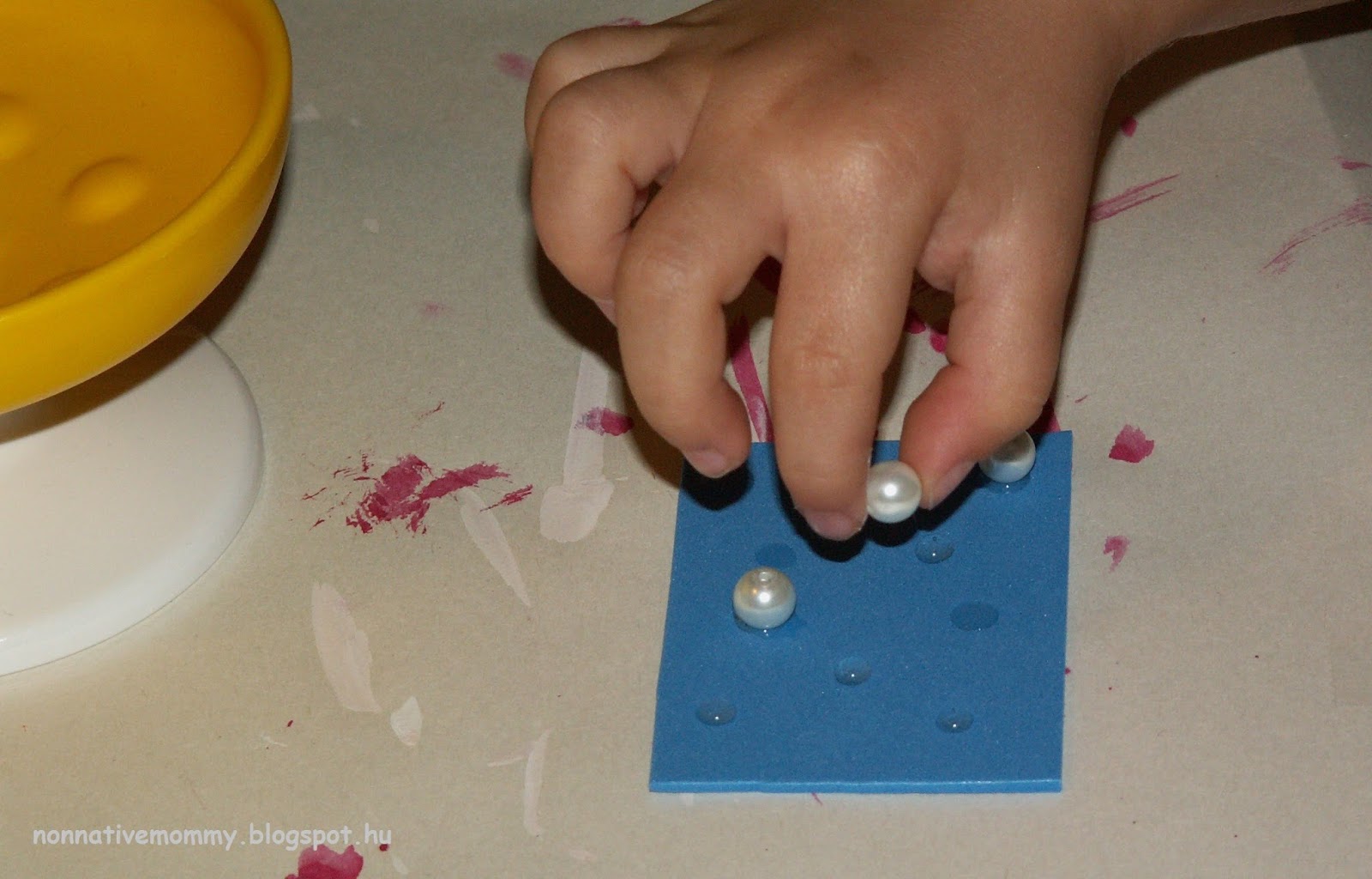 The stones had to be placed along the borderline as on the Hungarian flag (red, white, green) making a pattern ABCABC. This pattern is difficult for my daughter to follow so it was quite a strenuous exercise for her.