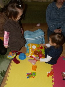 At home I started to prepare for dinner while they were playing in the living-room. Together. In English. E. helped L. draw some atoms, then they had a look at the “match the lid” box. E. applied imaginary body lotion on L, which she fancied so much. Next I saw them on the floor looking at some books.