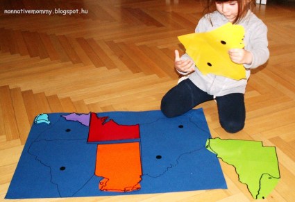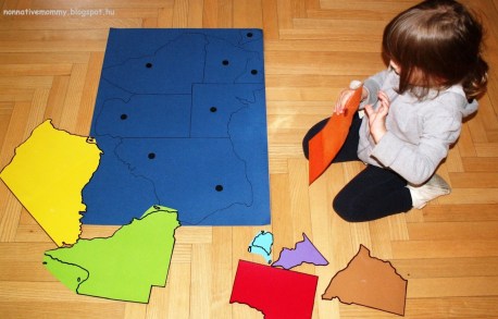 We can also use this puzzle map in the long run (I also plan to introduce her some cities as well as animals and famous sights. We’ll use this map to pin cities, animals and sights up on it and put it on the wall to display)