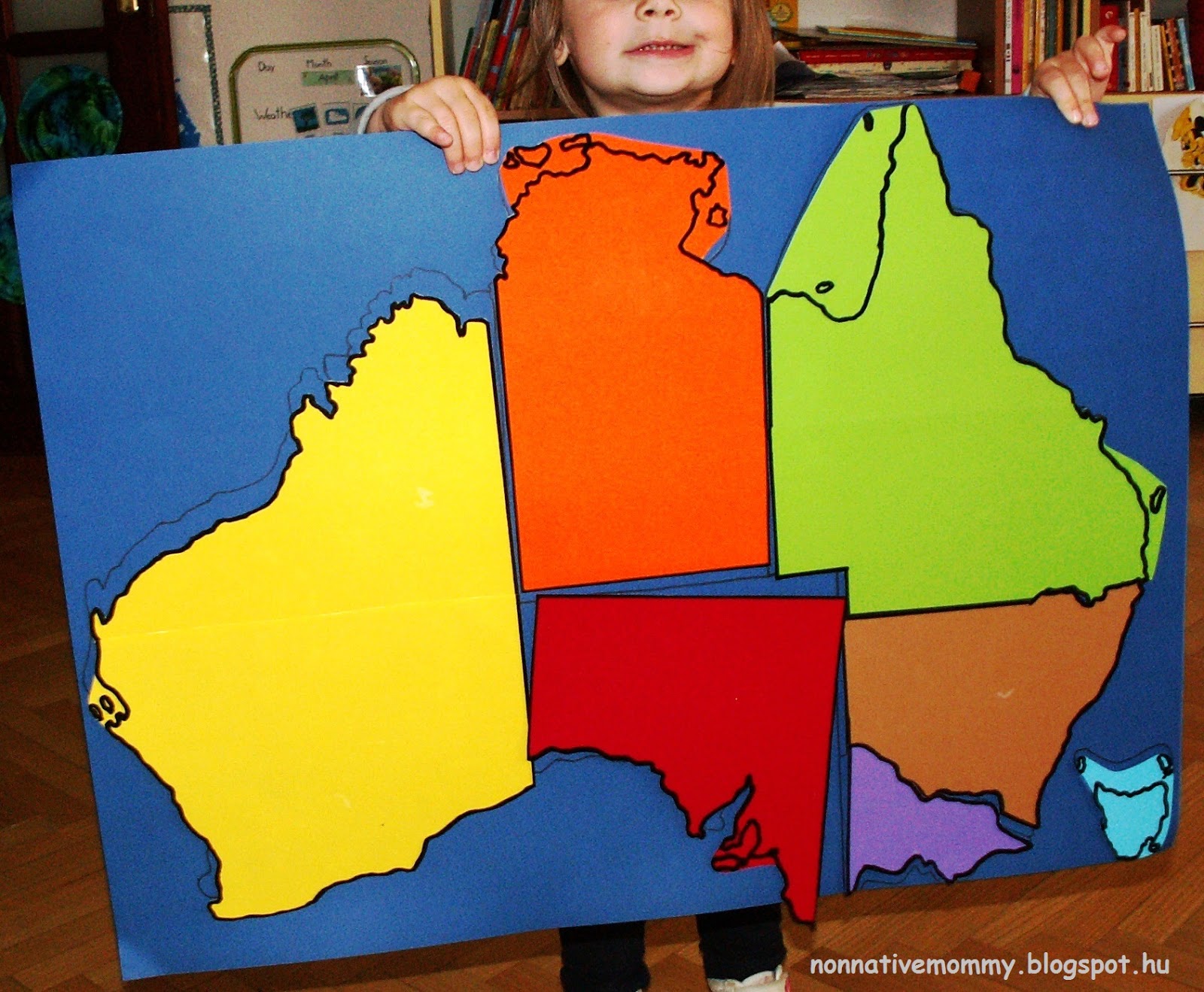 This Australian map puzzle was quite time-consuming to make but the result was beautiful and E. loved it. The link gives you a detailed description how to prepare it. In my version I laminated the pieces. As Queensland and Western Australia consist of 2 parts I sellotaped them together. Then I added sticky back velcro (bought them on sale in Auchan).