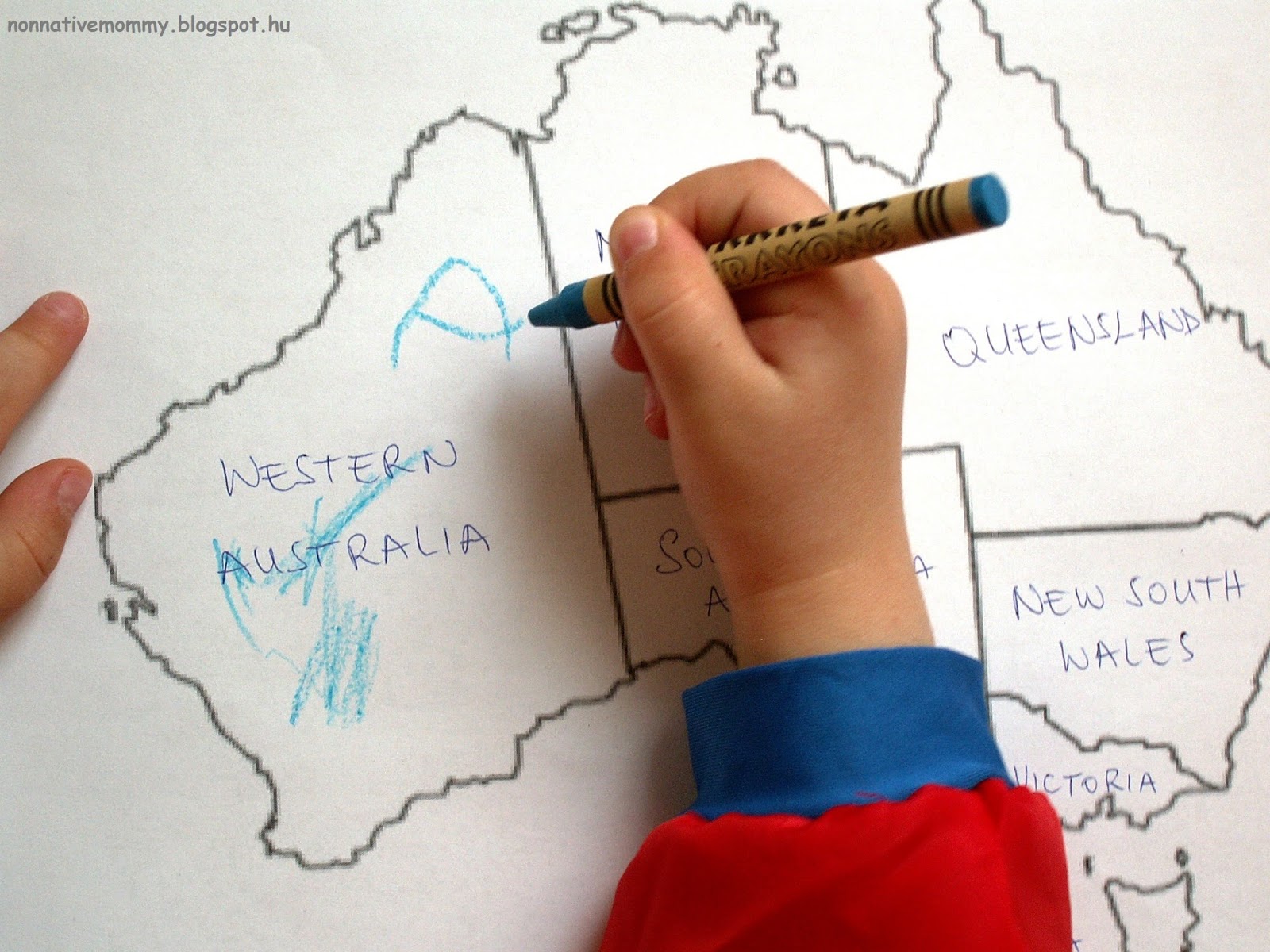 As E. enjoys looking at maps and our big picture atlas I made a map colouring activity for her. I just printed a blank Australia map with the states drawn on it and after naming each states we coloured them one by one.