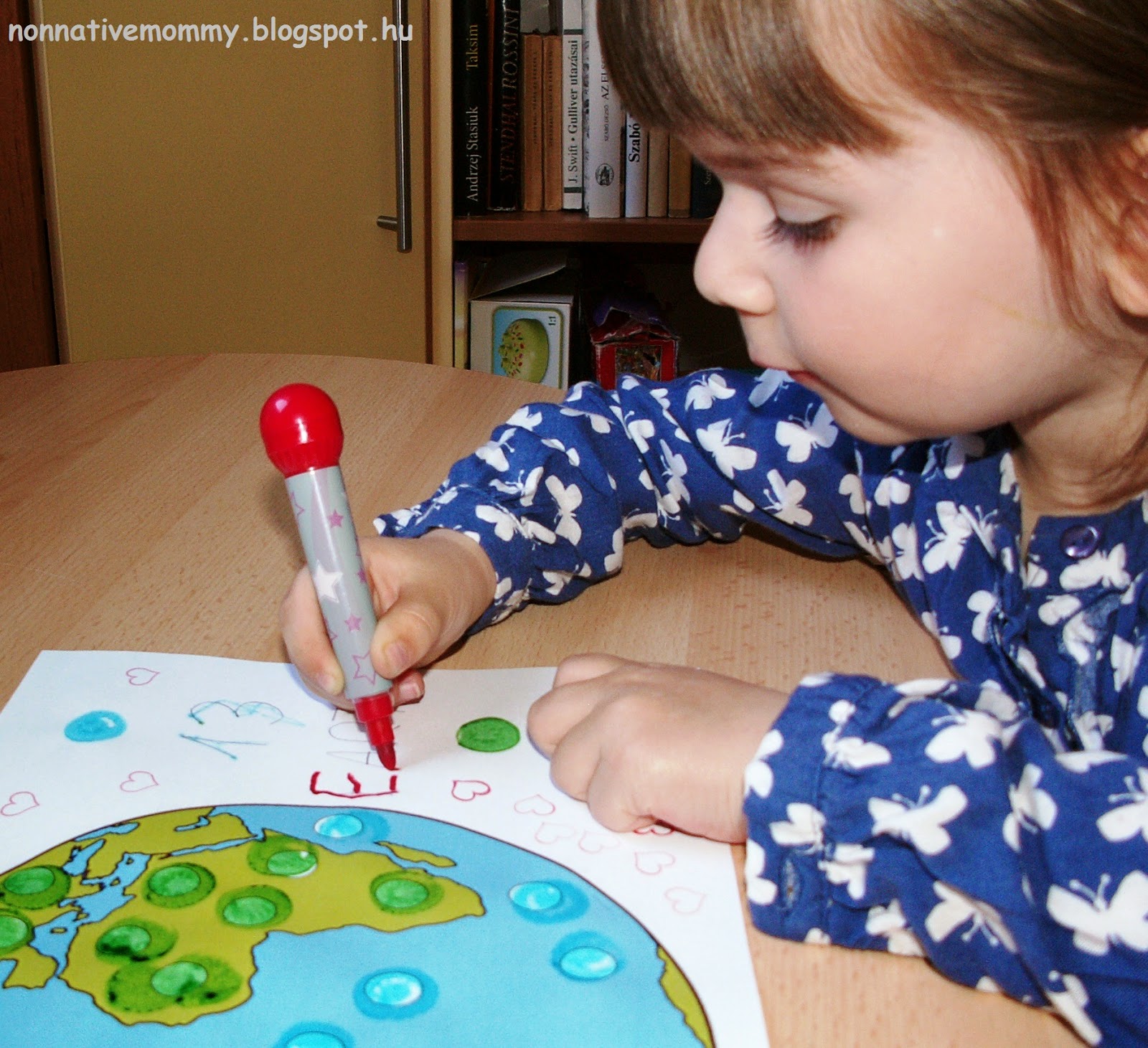 Another activity was dot-marker painting of Planet Earth. (If you have no dot-markers you can use cotton buds and blue and green paint or simply colour the dots with markers)