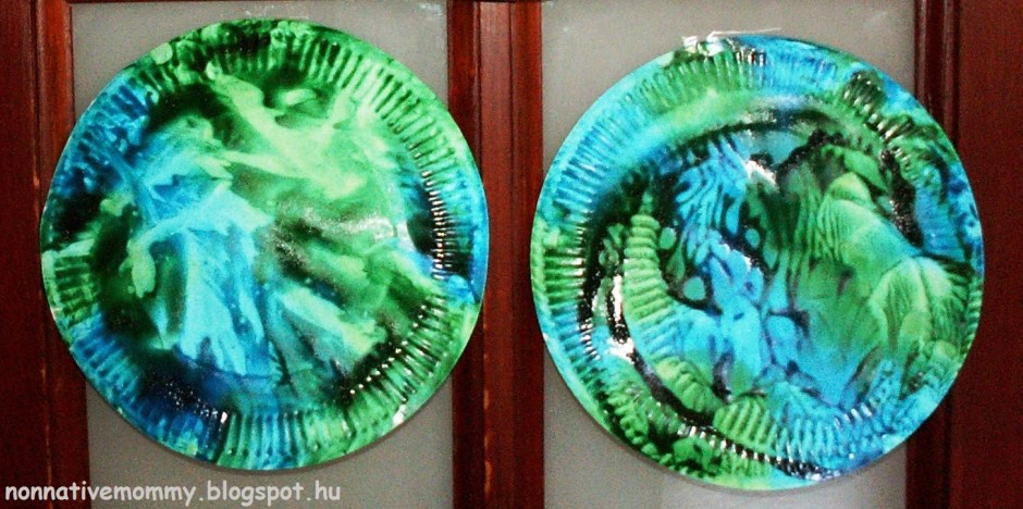 The first plate had too much paint on so we pressed it against another paper plate. Although it is called a MESS-FREE painting method, with this change everything became grubby.