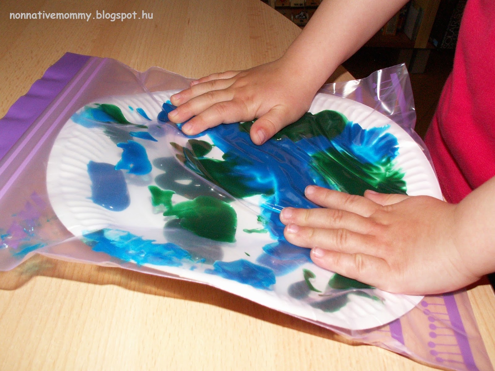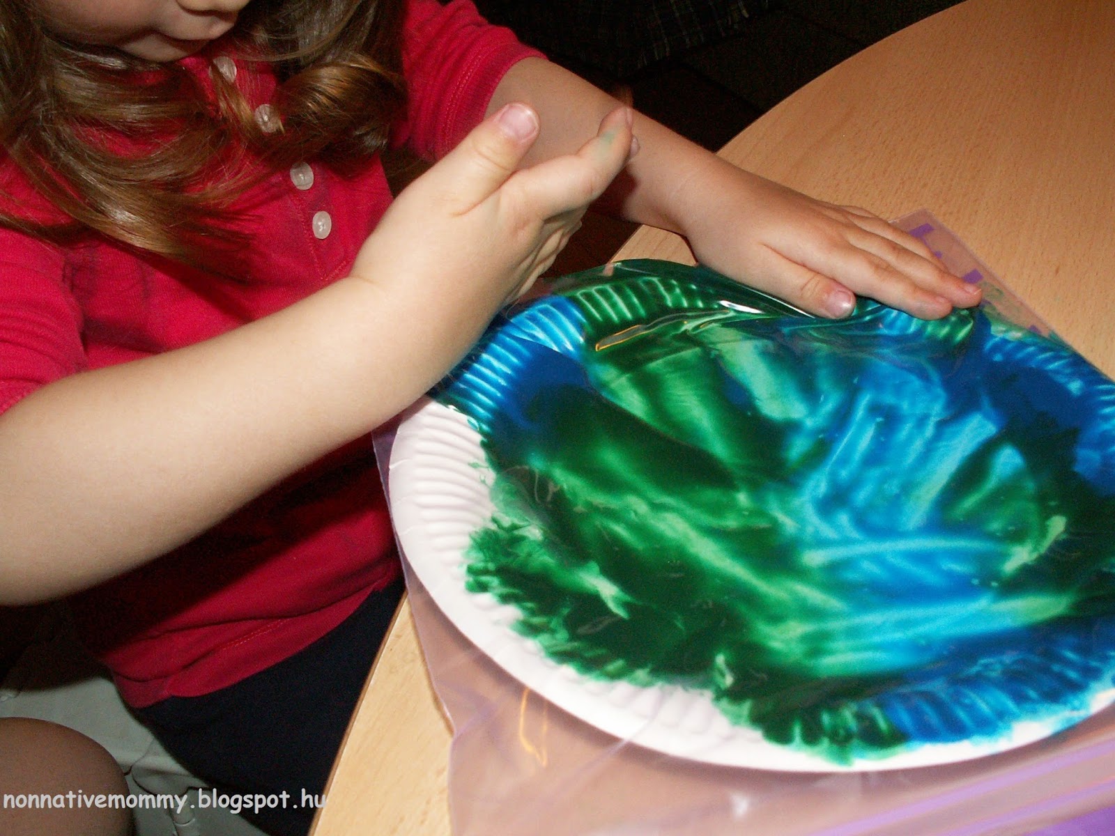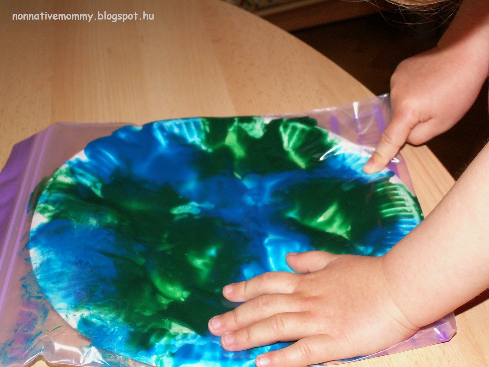 Before the recycling activity we had done some Earth related crafts like this mess-free zip-lock bag painting. Even very small kids can enjoy pressing the paint into all directions.
