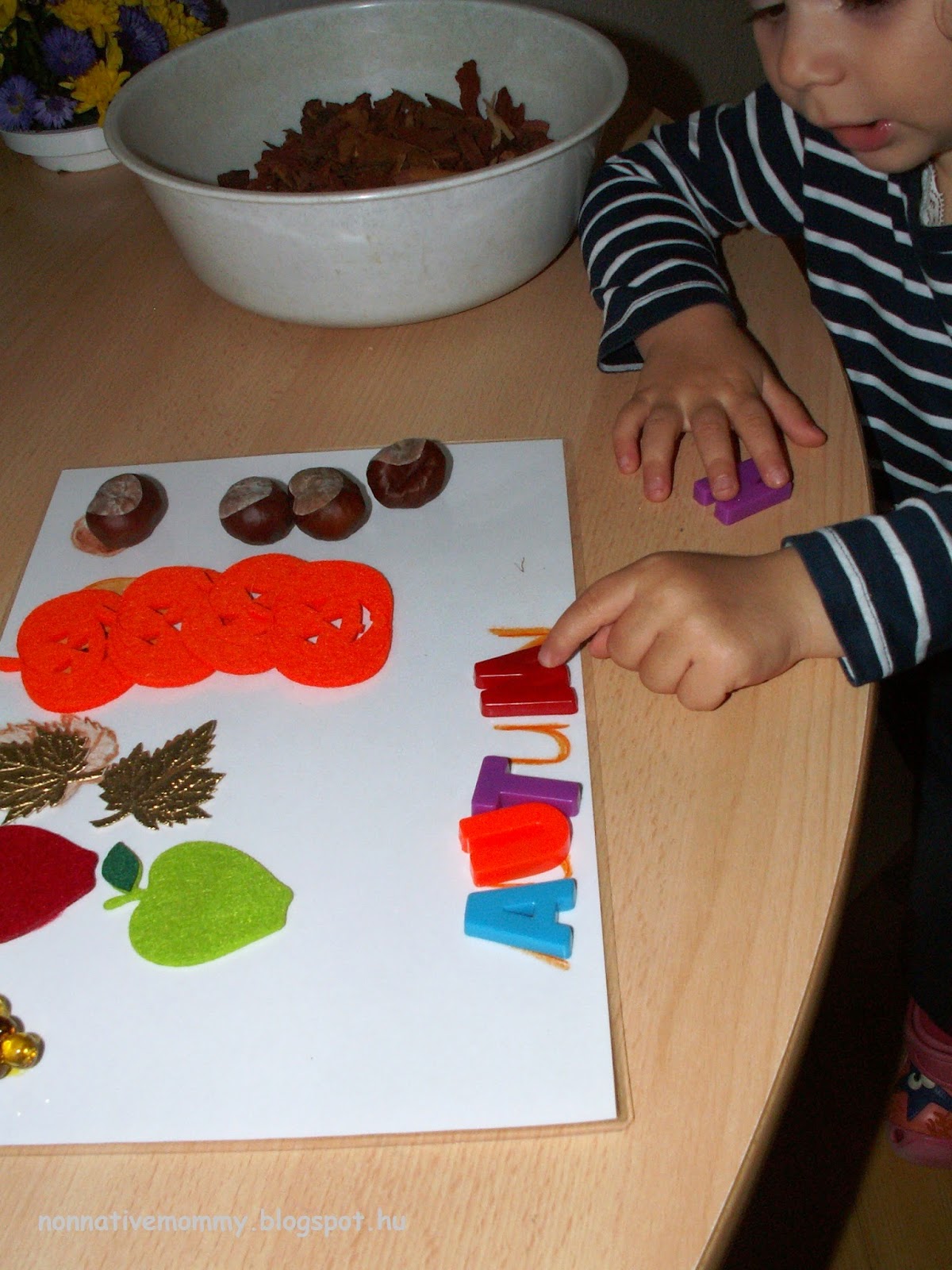 This activity gives you and your child plenty of opportunity to talk about not only the letters, but also colours, autumn fruit, trees, leaves and berries, and in this case numbers too.
