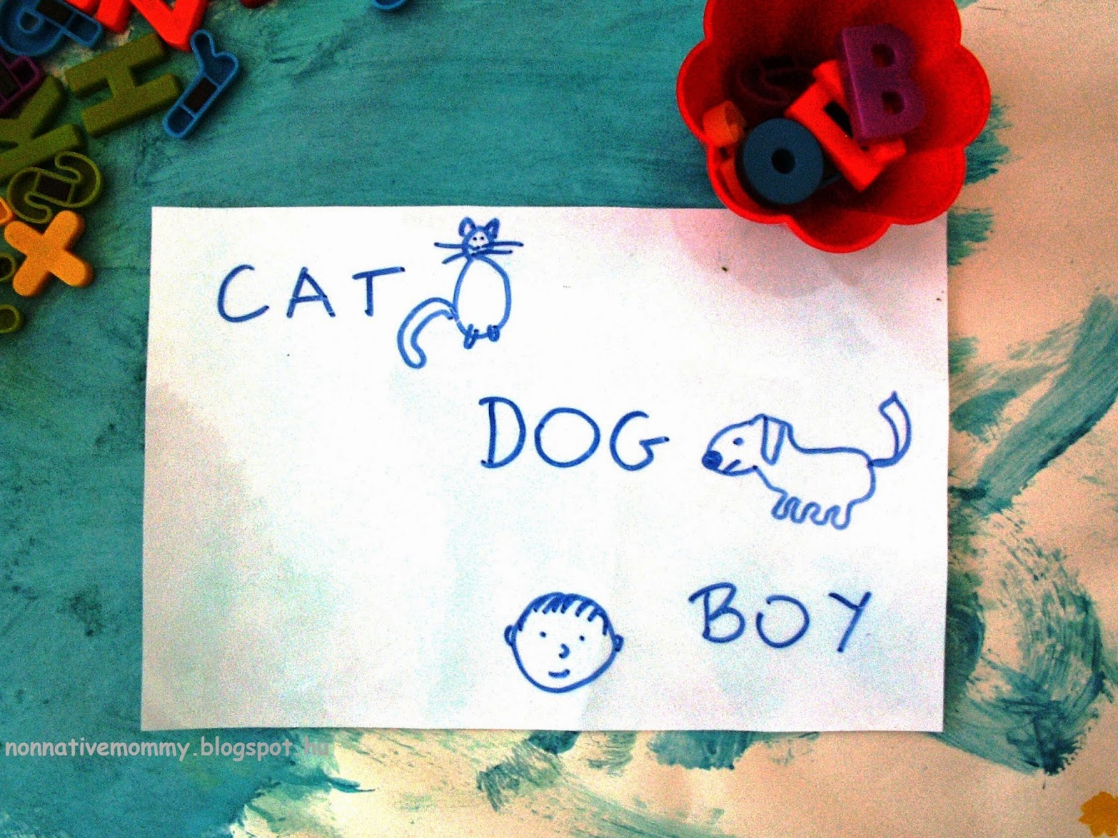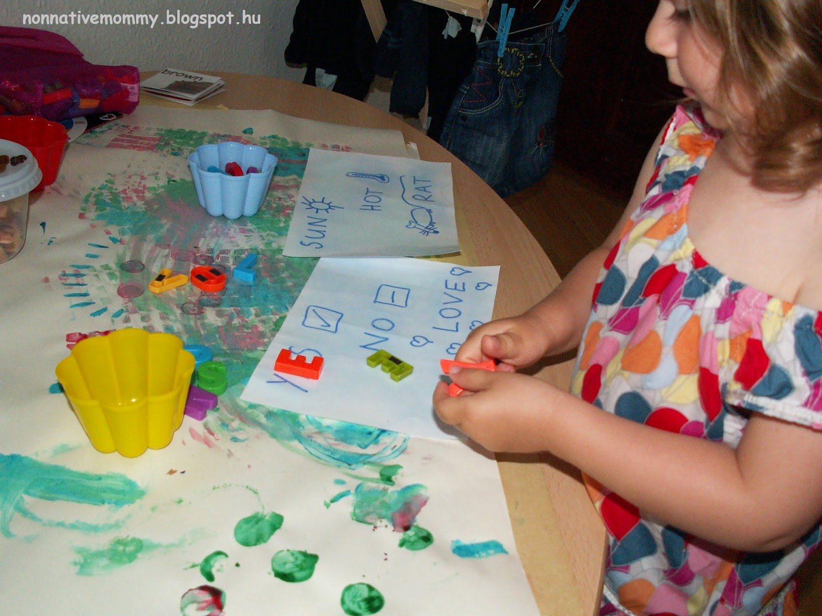 Next, we made up short words she was already familiar with. Daddy, Mummy, M. (our dog), dog, cat, yes, no, hat, rat, egg, bat and so on. I have no intention to teach her how to read. She is the one who, from time to time, comes to me with the letters to play with. She’ll work it out by herself.