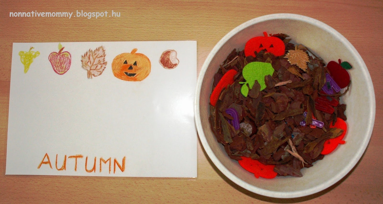 small object connected to autumn in some ways (berries, grapes, apples, pears, twigs, conkers, pumpkins, leaves etc. What I did was I chose 1 bunch of grapes made of plastic, 2 apples made of felt, 3 golden leaves, 4 pumpkins made of felt, 5 real conkers.)