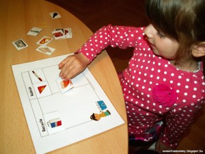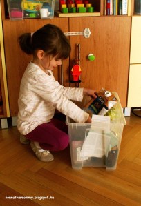 I prepared some colourful bottle tops for the girls. Green for treetops and bushes, yellow for pistils and the Sun, red, white, orange, red for the flowers. We also added some scrap paper for the trunks, stems (brown and green). The base of the picture was a blue A/4 sheet. (However, you can use a cardboard piece and paint the background.) Apart from the tree, flower and sun combo E. added some clouds and a bush under the tree. Little L. made a bird out of the brown paper and her flower is only a but, according to her. Very simple activity with very little preparation.