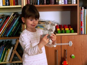 This activity is rather messy as the girls were stamping all over the table, but I’d put an old wax tablecloth on it and we used water based paint to wash it off easily.