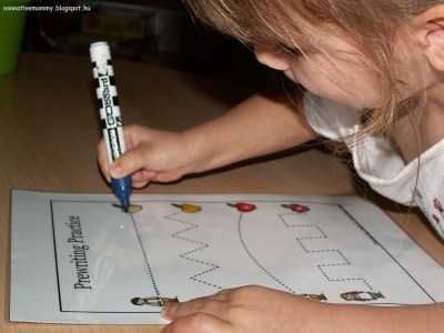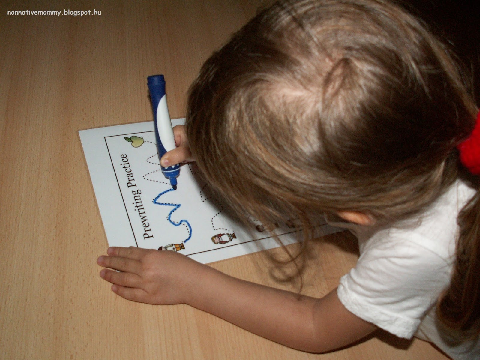 - Pre-writing practice. We tried the easier sheet (laminated so we can reuse them).