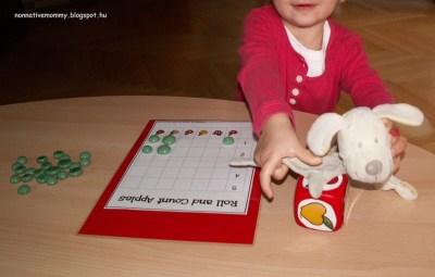 - Roll and count apples. I guess she enjoyed this one the most. I couldn’t find red manipulatives, so we had “green apples” instead of red ones.