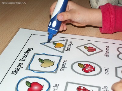 E.: – In the square there’s a green apple. In the triangle there is a yellow one. In the rectangle there’s a checked apple and in the oval a spotty apple… or… what’s the other name, Mommy?