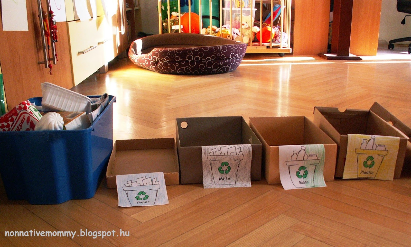 Then I printed, coloured (you can print the bins on coloured paper) and stuck the bins with different labels (plastic, glass metal, paper) on the side of the shoe boxes.