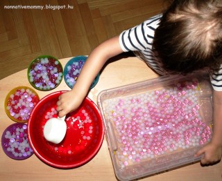 - Prepare the beads, the straws and foam rectangles, some measuring spoons or ladles, a let your child explore it.