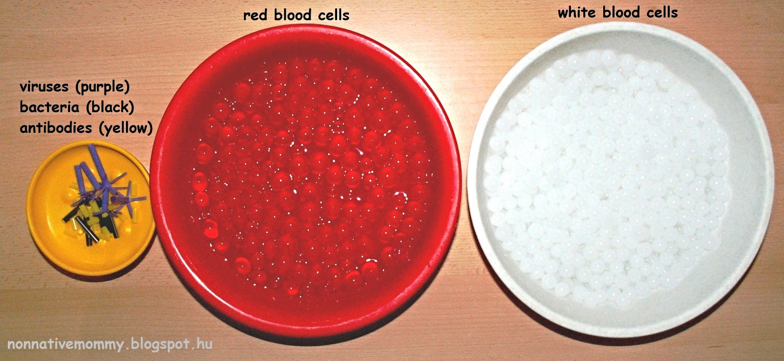 Few days ago I found the site where I first saw this idea: I can teach my child – What is blood made of? They use ping-pong balls for white blood cells… What a great idea!